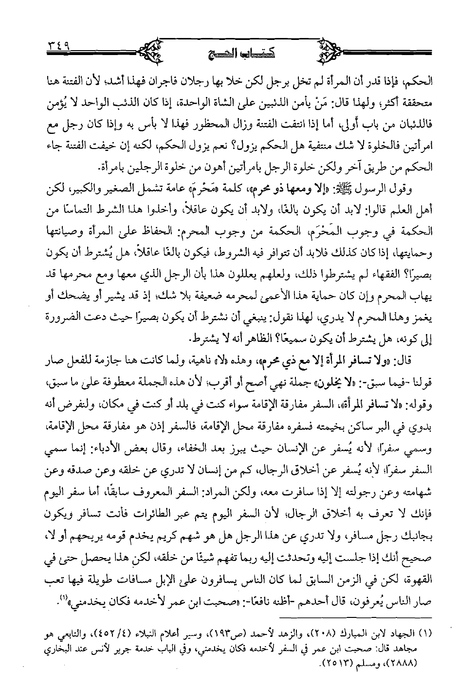 قال: "ولا تسافر المرأة إلا مع ذي محرم"، وهذه "لا"، ناهية، ولما كانت هنا جازمة للفعل صار قولنا - فيما سبق -: "لا يخلون" جملة نهي أصح أو أقرب؛ لأن هذه الجملة معطوفة على ما سبق، وقوله: "لا تسافر المرأة"، السفر مفارقة الإقامة سواء كنت في بلد أو كنت في مكان، ولنفرض أنه بدوي في البر ساكن بخيمته فسفره مفارقة محل الإقامة، فالسفر إذن هو مفارقة محل الإقامة، وسمي سفرًا؛ لأنه يسفر عن الإنسان حيث يبرز بعد الخفاء، وقال بعض الأدباء: إنما سمي السفر سفرًا؛ لأنه يسفر عن أخلاق الرجال، كم من إنسان لا تدري عن خلقه وعن صدقه وعن شهامته وعن رجولته إلا إذا سافرت معه، ولكن المراد: السفر المعروف سابقًا، أما سفر اليوم فإنك لا تعرف به أخلاق الرجال؛ لأن السفر اليوم يتم عبر الطائرات فأنت تسافر ويكون بجانبك رجل مسافر، ولا تدري عن هذا الرجل هل هو شهم كريم يخدم قومه يريحهم أو لا، صحيح أنك إذا جلست إليه وتحدثت إليه ربما تفهم شيئا من خلقه، لكن هذا يحصل حتى في القهوة، لكن في الزمن السابق لما كان الناس يسافرون على الإبل مسافات طويلة فيها تعب صار الناس يعرفون، قال أحدهم - أظنه نافعًا -: "صحبت ابن عمر لأخدمه فكان يخدمني" ().