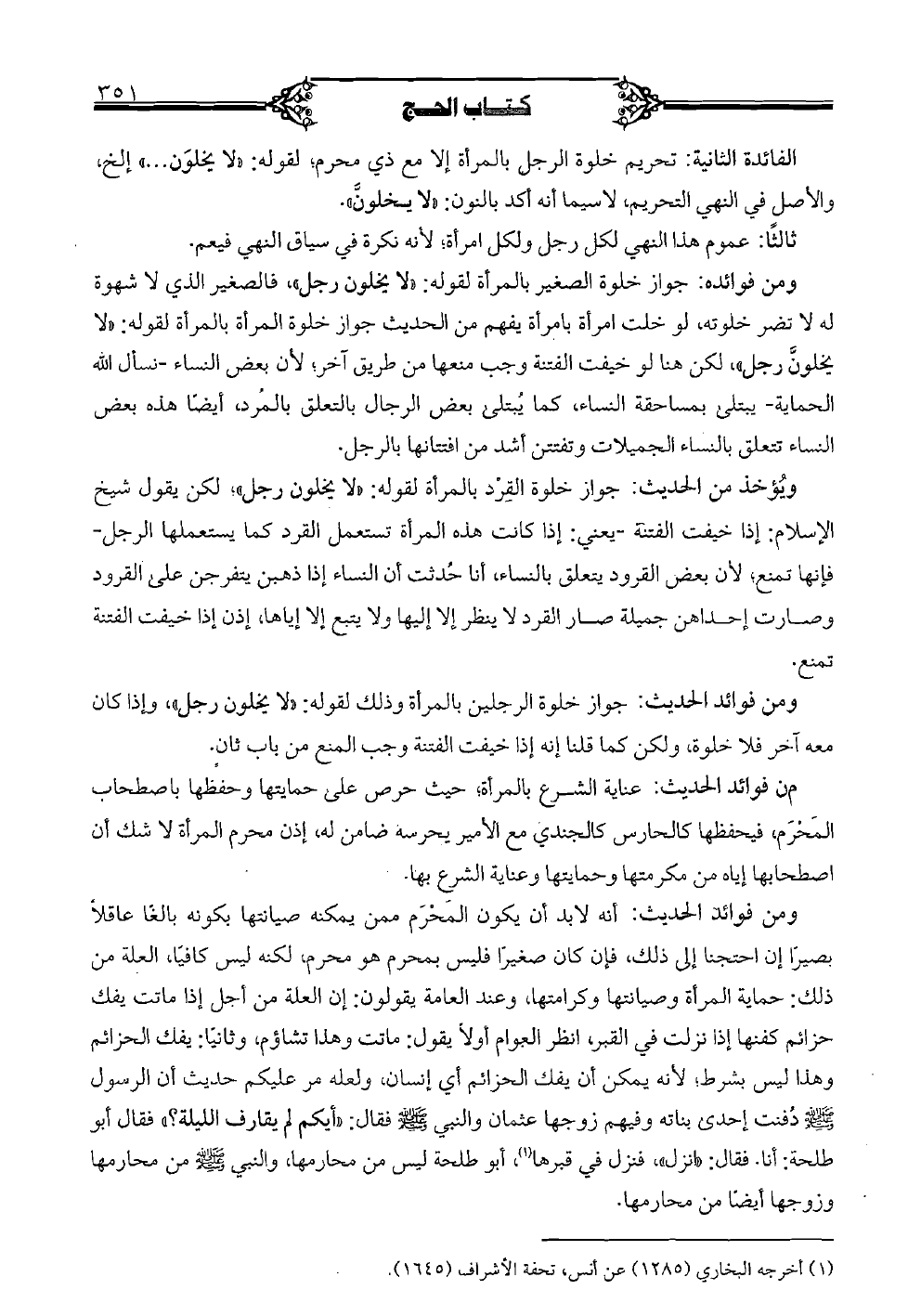 الفائدة الثانية: تحريم خلوة الرجل بالمرأة إلا مع ذي محرم، لقوله: "لا يخلون ... " إلخ، والأصل في النهي التحريم، لاسيما أنه أكد بالنون: "لا يخلونَّ".