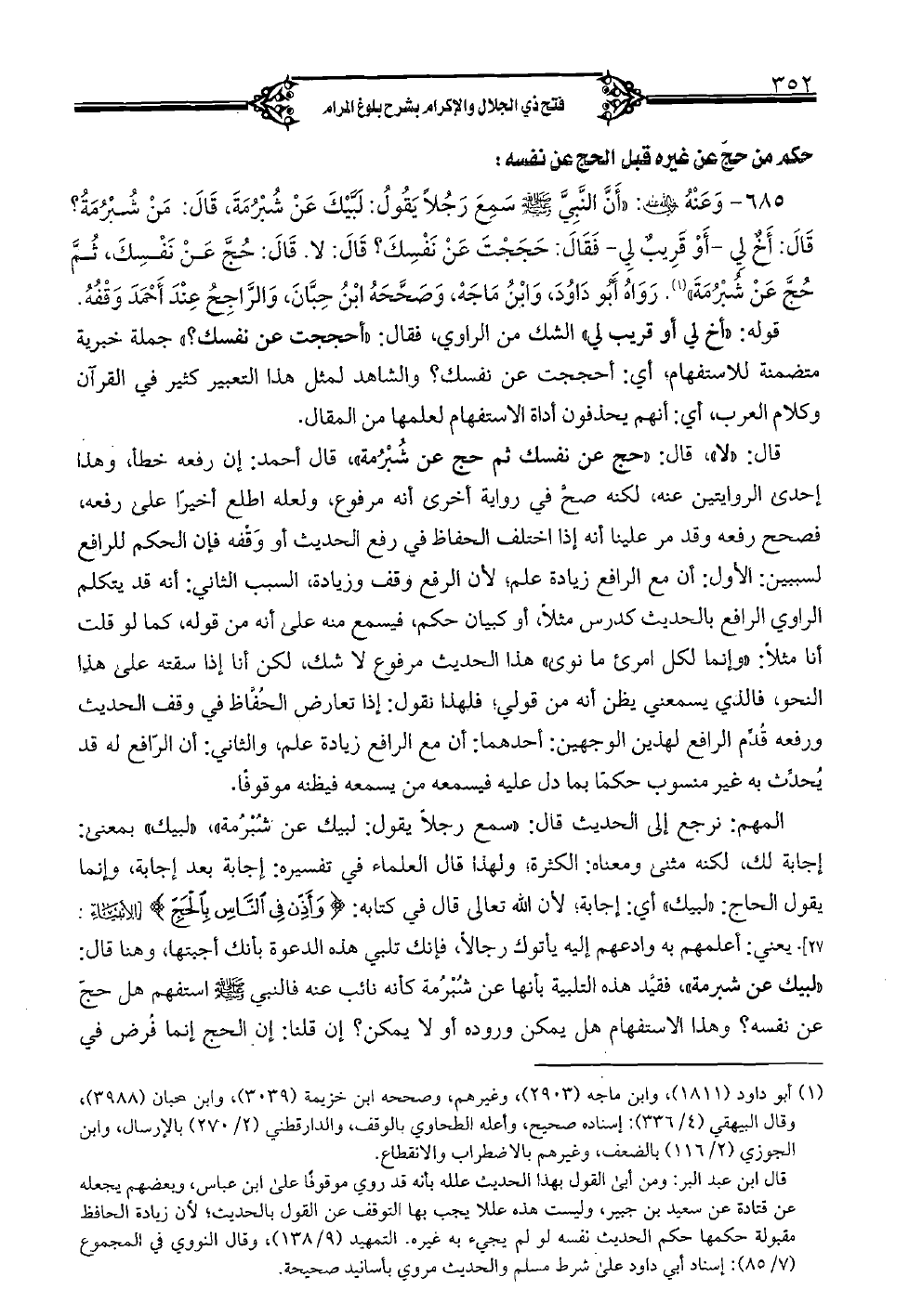 685 - وعنه رضي الله عنه: "أنَّ النَّبيَّ صلى الله عليه وسلم سمع رجلًا يقول: لبَّيك عن شبرمة، قال: من شبرمة؟ قال: أخٌ لي - أو قريبٌ لي - فقال: حججت عن نفسك؟ قال: لا. قال: حجَّ عن نفسك، ثمَّ حجَّ عن شبرمة" (). رواه أبو داود، وابن ماجه، وصحَّحه ابن حبَّان، والرَّاجح عند أحمد وقفه.