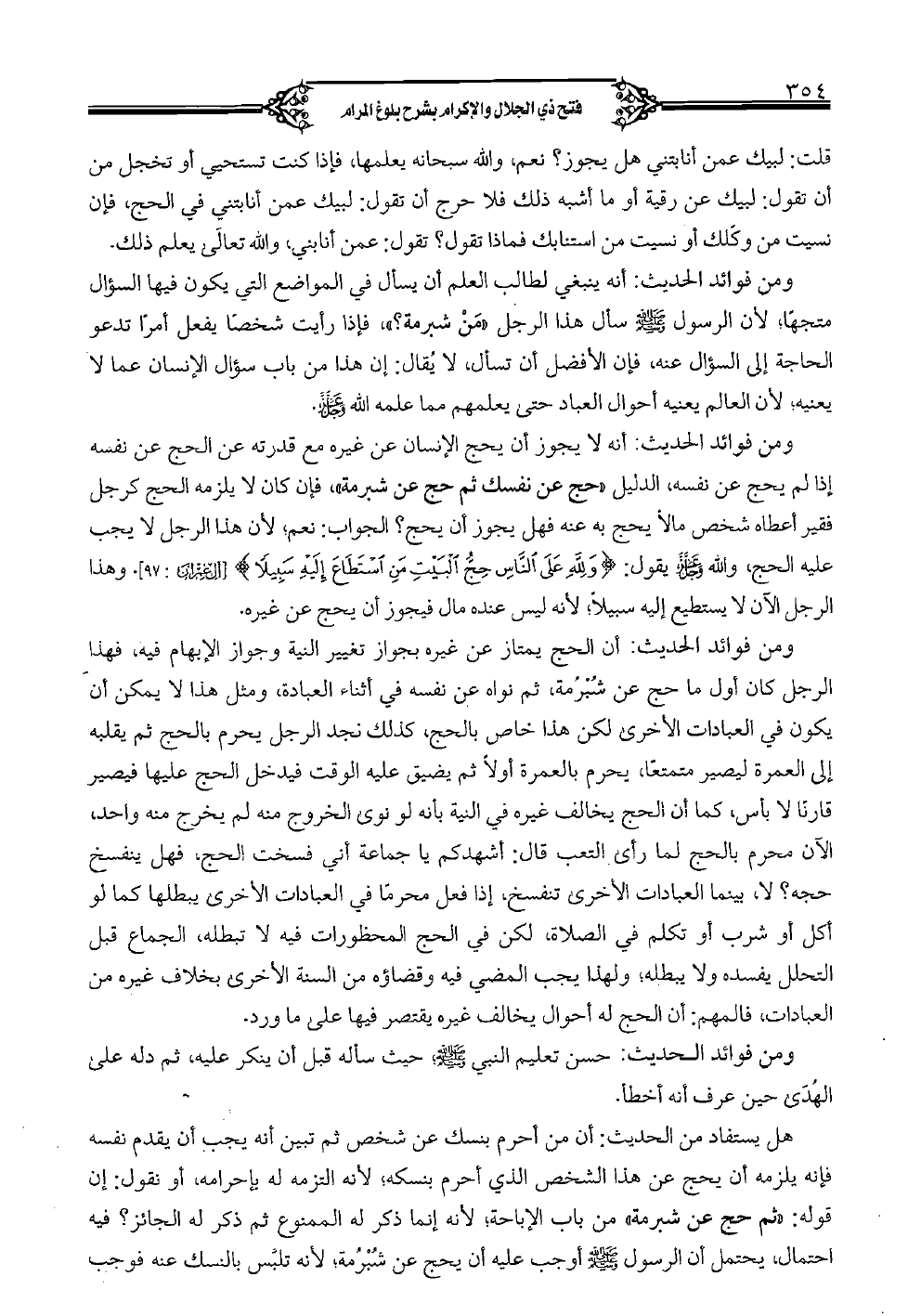 هل يستفاد من الحديث: أن من أحرم بنسك عن شخص ثم تبين أنه يجب أن يقدم نفسه فإنه يلزمه أن يحج عن هذا الشخص الذي أحرم بنسكه، لأنه التزمه له بإحرامه، أو تقول: أن قوله: ثم حج عن شبرمة، من باب الإباحة؛ لأنه إنما ذكر له الممنوع ثم ذكر له الجائز؟ فيه احتمال، يحتمل أن الرسول صلى الله عليه وسلم أوجب عليه أن يحج عن شبرمة؛ لأنه تلبس بالنسك عنه فوجب
