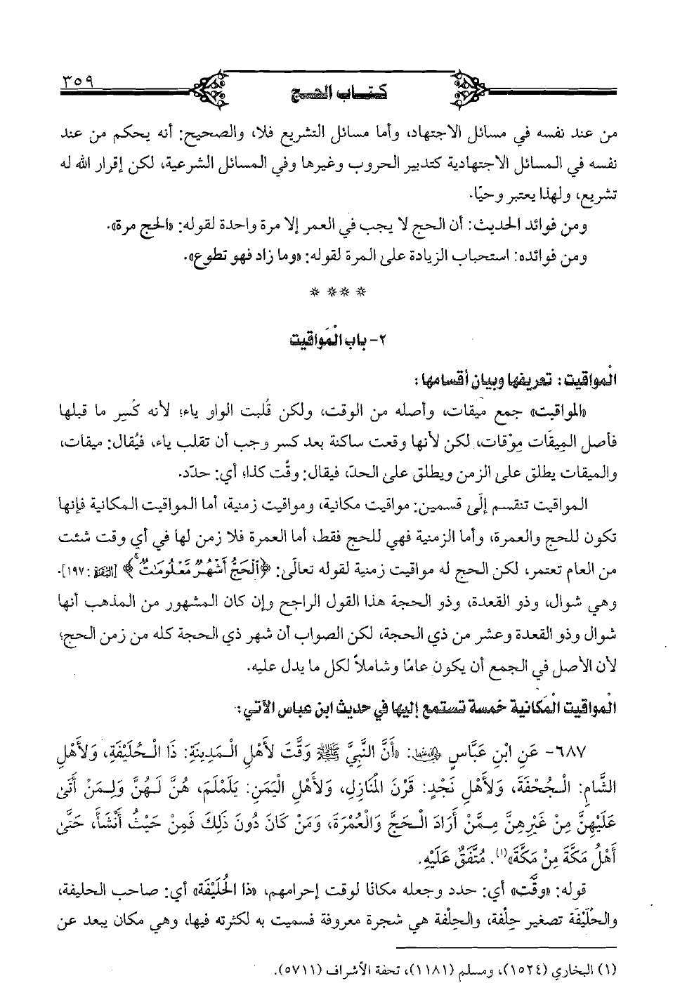 687 - عن ابن عباس رضي الله عنهما: "أنَّ النَّبيَّ صلى الله عليه وسلم وقَّت لأهل المدينة: ذا الخليفة، الشام: الجحفة، ولأهل نجدٍ: قرن المنازل، ولأهل اليمن: يلملم، هنَّ لهنَّ ولمن أتى عليهنَّ من غيرهنَّ ممَّن أراد الحجَّ والعمرة، ومن كان دون ذلك فمن حيت أنشأ، حتَّى أهل مكة من مكة" (). متَّفقٌ عليه.