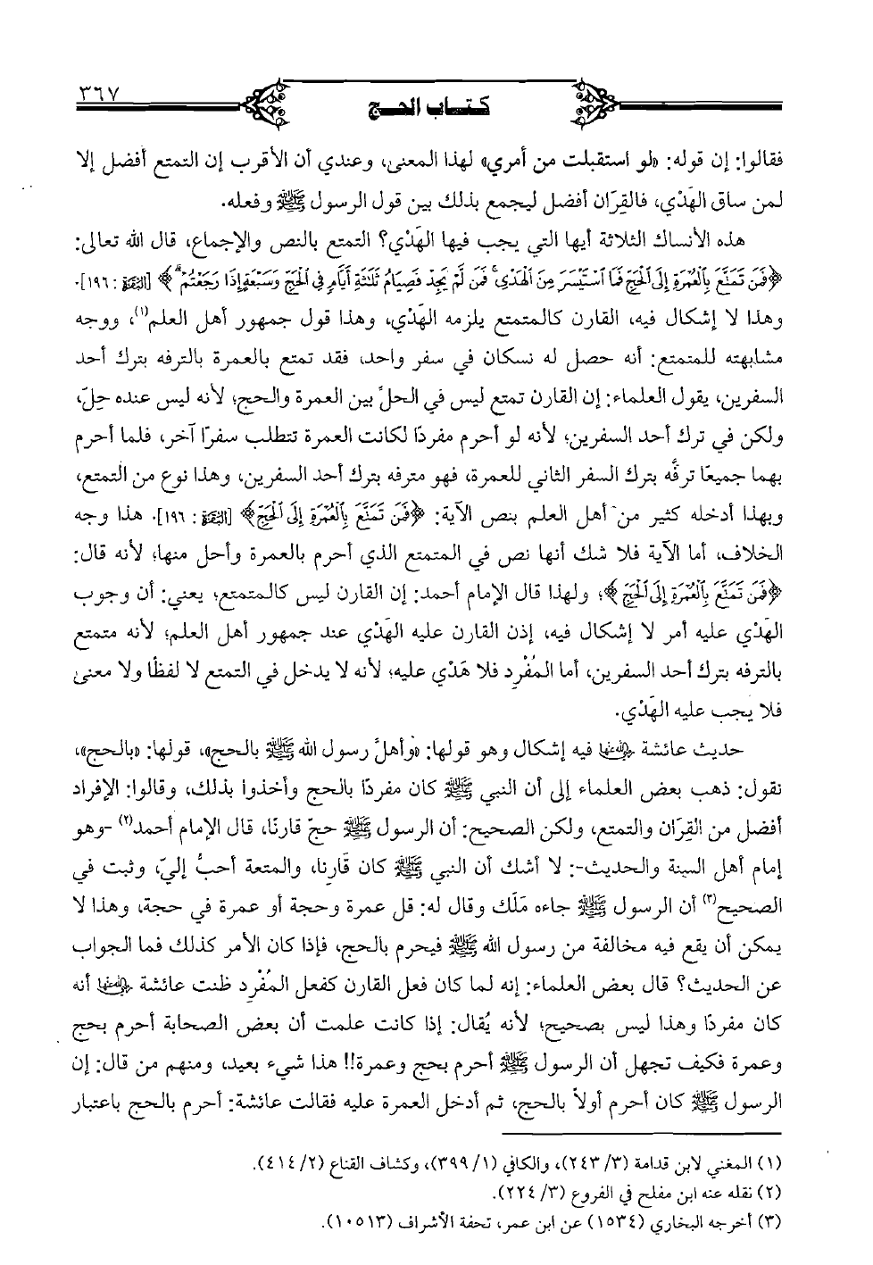 هذه الأنساك الثلاثة أيها التي يجب فيها الهدي؟ التمتع بالنص والإجماع، قال الله تعالى: {فَمَن تَمَتَّعَ بِالْعُمْرَةِ إلَى الحَجِّ فَمَا اسْتَيْسَرَ مِن الهَدْيِ فَمَن لَّمْ يَجِدْ فَصِيَامُ ثَلاثَةِ أَيَّامٍ فِي الحَجِّ وسَبْعَةٍ إذَا رَجَعْتُمْ} [البقرة: 196]. وهذا لا إشكال فيه، القارن كالمتمتع يلزمه الهدي، وهذا قول جمهور أهل العلم، ووجه مشابهته للمتمتع: أنه حصل له نسكان في سفر واحد، فقد تمتع بالعمرة بالترفه بترك أحد السفرين، يقول العلماء: إن القارن تمتع ليس في الحل بين العمرة والحج؛ لأنه ليس عنده حل، ولكن في ترك أحد السفرين؛ لأنه لو أحرم مفردًا لكانت العمرة تتطلب سفرًا آخر، فلما أحرم بهما جميعًا ترفه بترك السفر الثاني للعمرة، فهو مترفه بترك أحد السفرين، وهذا نوع من التمتع، وبهذا أدخله كثير من أهل العلم بنص الآية: {فَمَن تَمَتَّعَ بِالْعُمْرَةِ إلَى الحَجِّ}، ولهذا قال الإمام أحمد: إن القارن ليس كالمتمتع، يعني: أن وجوب الهدي عليه أمر لا إشكال فيه، إذن القارن عليه الهدي عند جمهور أهل العلم؛ لأنه متمتع بالترفة بترك أحد السفرين، أما المفرد فلا هدي عليه؛ لأنه لا يدخل في التمتع لا لفظًا ولا معنى فلا يجب عليه الهدي.