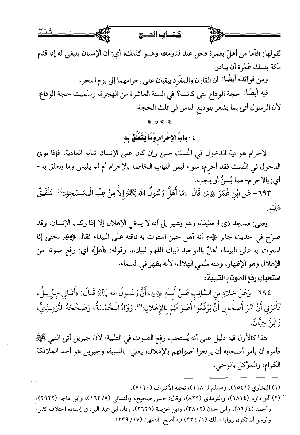 694 - وعن خلاد بن السائب عن أبيه رضي الله عنه، أن رسول الله صلى الله عليه وسلم قال: "أتاني جبريل، فأمرني أن أمر أصحابي أن يرفعوا أصواتهم بالإهلال". رواه الخمسة، وصححه الترمذي، وابن حبان.