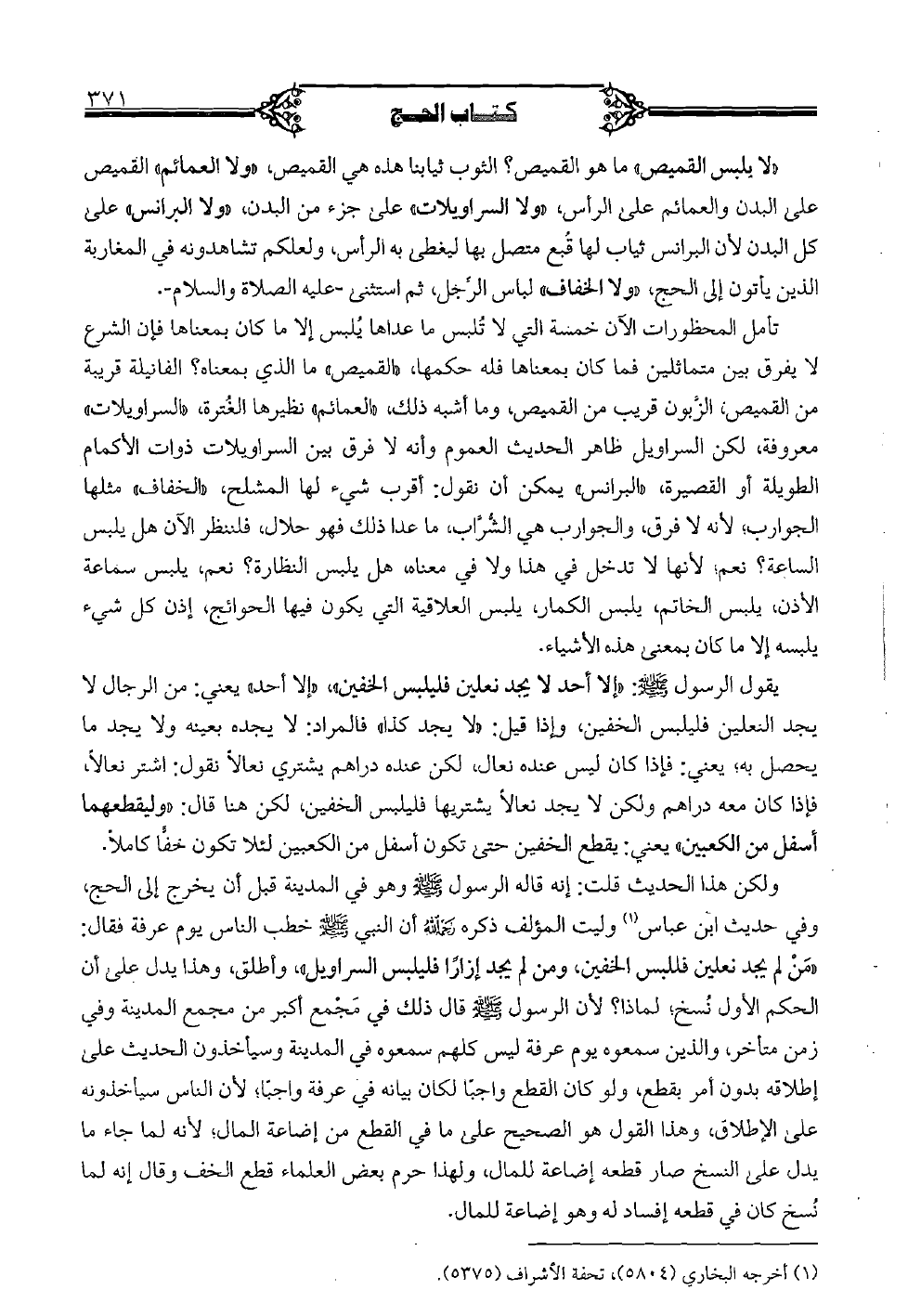 ولكن هذا الحديث قلت: إنه قاله الرسول صلى الله عليه وسلم وهو في المدينة قبل أن يخرج إلى الحج، وفي حديث ابن عباس وليت المؤلف ذكره رحمه الله أن النبي صلى الله عليه وسلم خطب الناس يوم عرفة فقال: "من لم يجد نعلين فللبس الخفين، ومن لم يجد أزارًا فليلبس السراويل"، وأطلق، وهذا يدل على أن الحكم الأول نسخ؛ لماذا؟ لأن الرسول صلى الله عليه وسلم قال ذلك في مجمع أكبر من مجمع المدينة وفي زمن متأخر، والذين سمعوه يوم عرفة ليس كلهم سمعوه في المدينة وسيأخذون الحديث على إطلاقه بدون أمر بقطع، ولو كان القطع واجبًا لكان بيانه في عرفة واجبًا، لأن الناس سيأخذونه على الإطلاق، وهذا القول هو الصحيح على ما في القطع من إضاعة المال؛ لأنه لما جاء ما يدل على النسخ صار قطعه إضاعة للمال، ولهذا حرم بعض العلماء قطع الخف وقال إنه لما نسخ كان في قطعه إفساد وهو إضاعة للمال.