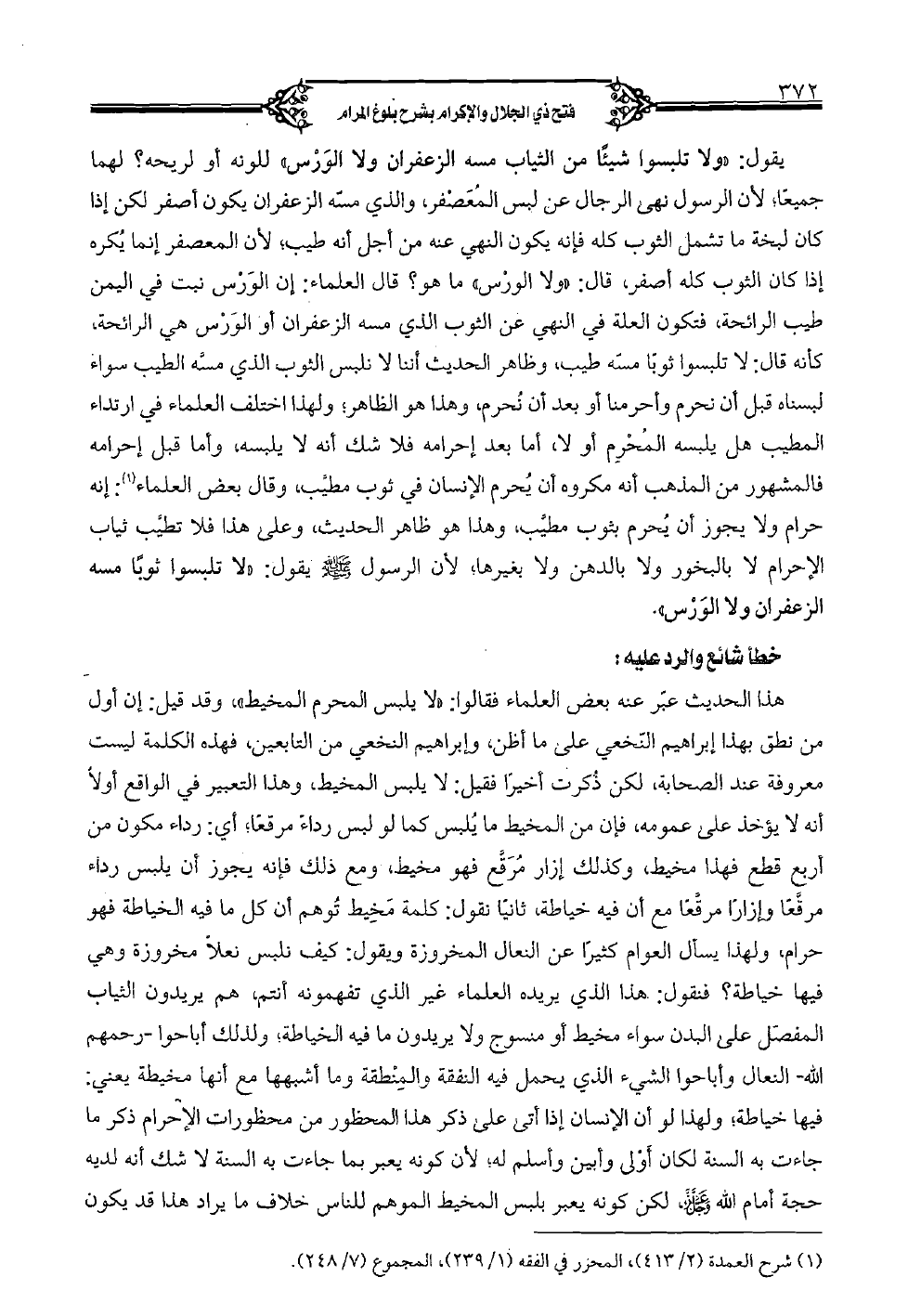 يقول: "ولا تلبسوا شيئًا من الثياب مسه الزعفران ولا الورس" للونه أو لريحه؟ لهما جميعًا؛ لأن الرسول نهى الرجال عن لبس المعصفر، والذي مسه الزعفران يكون أصفر لكن إذا كان لبخة ما تشم الثوب كله فإنه يكون النهي عنه من أجل أنه طيب؛ لأن المعصفر إنما يكره إذا كان الثوب كله أصفر، قال: "ولا الورس" ما هو" قال العلماء: إن الورس نبت في اليمن طيب الرائحة، فتكون العلة في النهي عن الثوب الذي مسه الزعفران أو الورس هي الرائحة، كأنه قال: لا تلبسوا ثوبًا مسه طيب، وظاهر الحديث أننا لا نلبس الثوب الذي مسه الطيب سواء لبسناه قبل أن نحرم وأحرمنا أو بعد أن نحرم، وهذا هو الظاهر؛ ولهذا اختلف العلماء في ارتداء المطيب هل يلبسه المحرم أو لا، أما بعد إحرامه فلاشك أنه لا يلبسه، وأما قبل إحرامه فالمشهور من المذهب أنه مكروه أن يحرم الإنسان في ثوب مطيب، وقال بعض العلماء: إنه حرام ولا يجوز أن يحرم بثوب مطيب، وهذا هو ظاهر الحديث، وعلى هذا فلا تطيب ثياب الإحرام لا بالبخور ولا بالدهن ولا يغيرها؛ لأن الرسول صلى الله عليه وسلم يقول: "لا تلبسوا ثوبًا مسه الزعفران أو الورس".