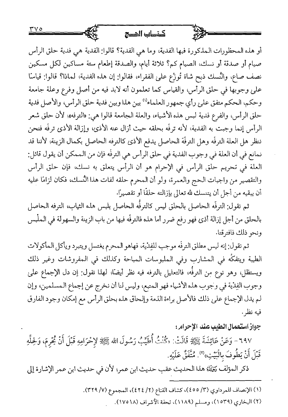 ثم نقول: إنه ليس مطلق الترفه موجب للفدية، فها هو المحرم يغتسل ويتبرد ويأكل المأكولات الطيبة ويتفكه في المشارب وفي الملبوسات المباحة وكذلك في المفروشات وغير ذلك ويستظل، وهو نوع من الترفه، فالتعليل بالترفه فيه نظر أيضًا؛ لهذا نقول: إن دل الإجماع على وجوب الفدية في وجوب هذه الأشياء فهو المتبع، وليس لنا أن نخرج عن إجماع المسلمين، وإن لم يدل الإجماع على ذلك فالأصل براءة الذمة وإلحاق هذه بحلق الرأس مع إمكان وجود الفارق فيه نظر.