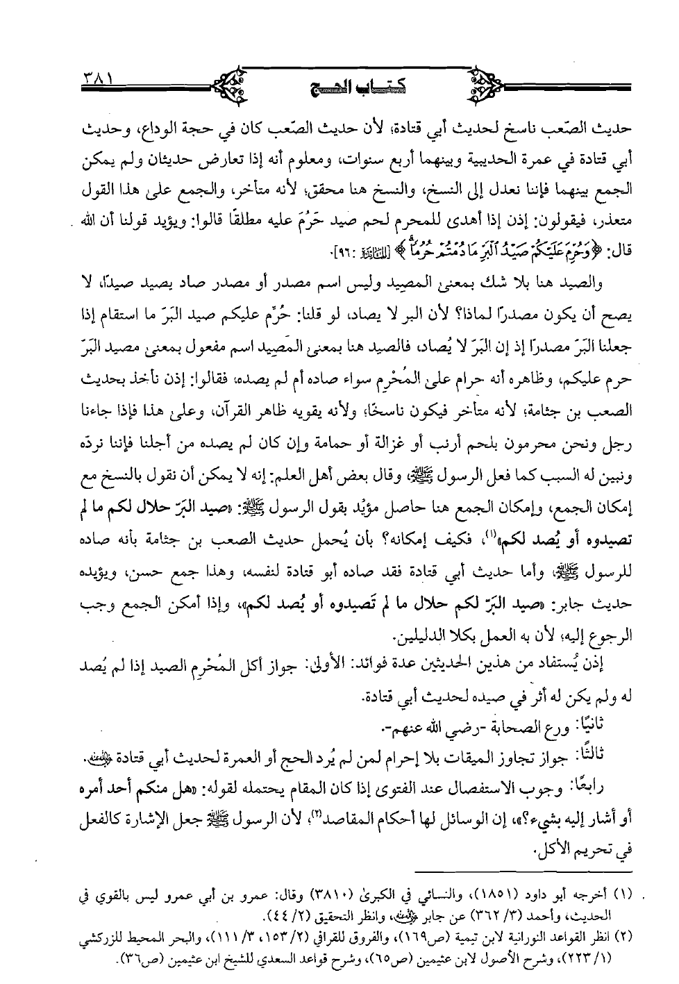 والصيد هنا بلا شك بمعنى المصيد وليس اسم مصدر أو مصدر صاد بصيد صيدًا، لا يصح أن يكون مصدرًا لماذا؟ لأن البر لا يصاد، لو قلنا: حرم عليكم صيد البر ما استقام إذا جعلنا البر مصدرًا إذ إن البر لا يصاد، فالصيد هنا بمعنى المصيد اسم مفعول بمعنى مصيد البر حرم عليكم، وظاهره أنه حرام على المحرم سواء صاده أم لم يصده، فقالوا: إذن نأخذ بحديث الصعب بن جثامة؛ لأنه متأخر فيكون ناسخًا؛ ولأنه متأخر فيكون ناسخًا؛ ولأنه يقويه ظاهر القرآن، وعلى هذا فإذا جاءنا رجل ونحن محرمون بلحم أرنب أو غزالة أو حمامة وإن كان لم يصده من أجلنا فإننا نرده ونبين له السبب كما فعل الرسول صلى الله عليه وسلم، وقال بعض أهل العلم: إنه لا يمكن أن نقول بالنسخ مع إمكان الجمع، وإمكان الجمع هنا حاصل مؤيد بقول الرسول صلى الله عليه وسلم: "صيد البر حلال لكم ما لم تصيدوه أو يصد لكم"، فكيف إمكانه؟ بأن يحمل حديث الصعب بن جثامة بأنه صاده للرسول صلى الله عليه وسلم، وأما حديث أبي قتادة فقد صاده أبو قتادة لنفسه، وهذا جمع حسن، ويؤيده حديث جابر: "صيد البر لكم حلال ما لم تصيدوه أو يصد لكم"، وإذا أمكن المع وجب الرجوع إليه؛ لأن به العمل بكلا الدليلين.