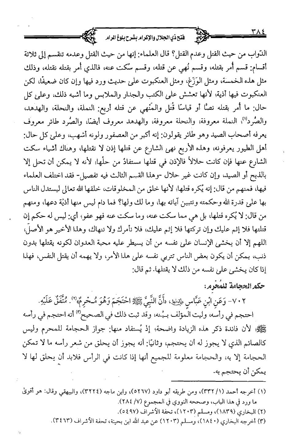 الدواب من حيث القتل وعدم القتل؟ قال العلماء: إنها من حيث القتل وعدمه تنقسم إلى ثلاثة أقسام: قسم أمر بقتله، وقسم نهي عن قتله، وقسم سكت عنه، فالذي أمر بقتله نقتله، وذلك مثل هذه الخمسة، ومثل الوزغ، ومثل العنكبوت على حديث ورد فيها وإن كان ضعيفًا، لكن العنكبوت فيها أذية؛ لأنها تعشش على الكتب والجدار والملبس وما أشبه ذلك، وعلى كل حال: ما أمر بقتله نصًا أو قياسًا قتل والمنهي عن قتله أربع: النملة، والنحلة، والهدهد، والصرد؛ النملة معروفة، والنحلة معروفة، والهدهد معروف أيضًا، والصرد طائر معروف يعرفه أصحاب الصيد وهو طائر يقولون: إنه أكبر من العصفور ولونه أشهب، وعلى كل حال: أهل الطيور يعرفونه، وهذه الأربع نهى الشارع عن قتلها إذن لا نقتلها، وهناك أشياء سكت الشارع عنها فإن كانت حلالًا فالإذن في قتلها مستفاد من حلها؛ لأنه لا يمكن أن تحل إلا بالذبح أو الصيد، وإن كانت غير حلال -وهذا القسم الثالث فيه تفصيل -فقد اختلف العلماء فيها، فمنهم من قال: إنه يكره قتلها؛ لأنها خلق من المخلوقات، خلقها الله تعالى ليستدل الناس بها على قدرة الله وحكمته وتتبين آياته بها، وما لك ولها؟ فما دام ليس منها أذية دعها، ومنهم من قال: لا يكره قتلها، بل هي مما سكت عنه، وما سكت عنه فهو عفو؛ أي: ليس له حكم إن قتلتها فلا إثم عليك وإن تركتها فلا إثم عليك، فلا نأمرك ولا ننهاك، وهذا الأخير هو الأصل، اللهم إلا أن يخشى الإنسان على نفسه من أن يسيطر عليه محبة العدوان لكونه يقتلها بدون ذنب، يمكن أن يكون بعض الناس تتربي نفسه على هذا الأمر، ولا يهمه أن يقتل النفس، فهذا إذا كان يخشى على نفسه من ذلك لا يقتلها. ثم قال: