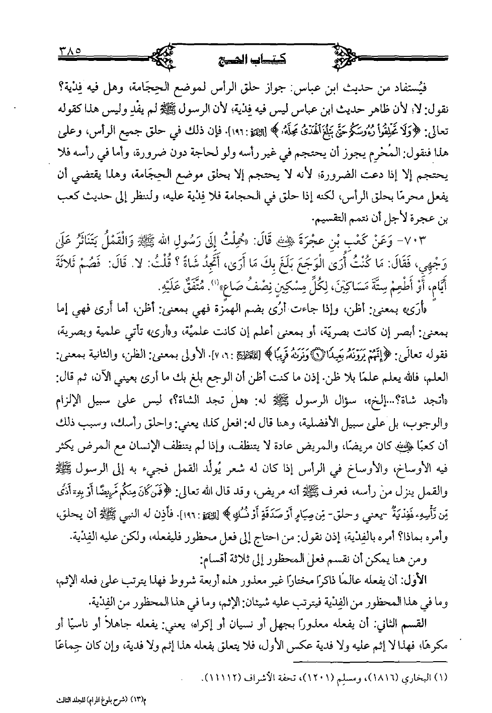 "أرى" بمعنى: أظن، وإذا جاءت أرى بضم الهمزة فهي بمعنى: أظن، أما أرى فهي إما بمعنى: أبصر إن كانت بصرية، أو بمعنى أعلم إن كانت علمية، و"أرى" تأتي عملية وبصرية، فقوله تعالى: {إنَّهُمْ يَرَوْنَهُ بَعِيدًا {6} ونَرَاهُ قَرِيبًا} [المعارج: 6، 7]. الأأولى بمعنى: الظن، والثانية بمعنى: العلم، فالله يعلم علمًا بلا ظن. إذن ما كنت أظن أن الوجع بلغ بك ما أرى بعيني الآن، ثم قال: "أتجد شاة؟ .... إلخ"، سؤال الرسول صلى الله عليه سولم له: "هل تجد الشاة؟ " ليس على سبيل الإلزام والوجوب، بل على سبيل الأفضلية، وهنا قال له: افعل كذا، يعني: واحلق رأسك، وسبب ذلك أن كعبًا رضي الله عنه كان مريضًا، والمريض عادة لا يتنظف، وإذا لم يتنظف الإنسان مع المرض يكثر فيه الأوساخ، والأوساخ في الرأس إذا كان له شعر يولد القمل فجئ به إلى الرسول صلى الله عليه وسلم والقمل ينزل من رأسه، فعرف صلى الله عليه وسلم أنه مريض، وقد قال الله تعالى: {فَمَن كَانَ مِنكُم مَّرِيضًا أَوْ بِهِ أَذًى مِّن رَّأْسِهِ فَفِدْيَةٌ -يعني وحلق- مِّن صِيَامٍ أَوْ صَدَقَةٍ أَوْ نُسُكٍ} [البقرة: 196]. فأذن له النبي صلى الله عليه وسلم أن يحلق، وأمره بماذا؟ أمره بالفدية؛ إذن نقول: من احتاج إلى فعل محظور فليفعله، ولكن عليه الفدية.