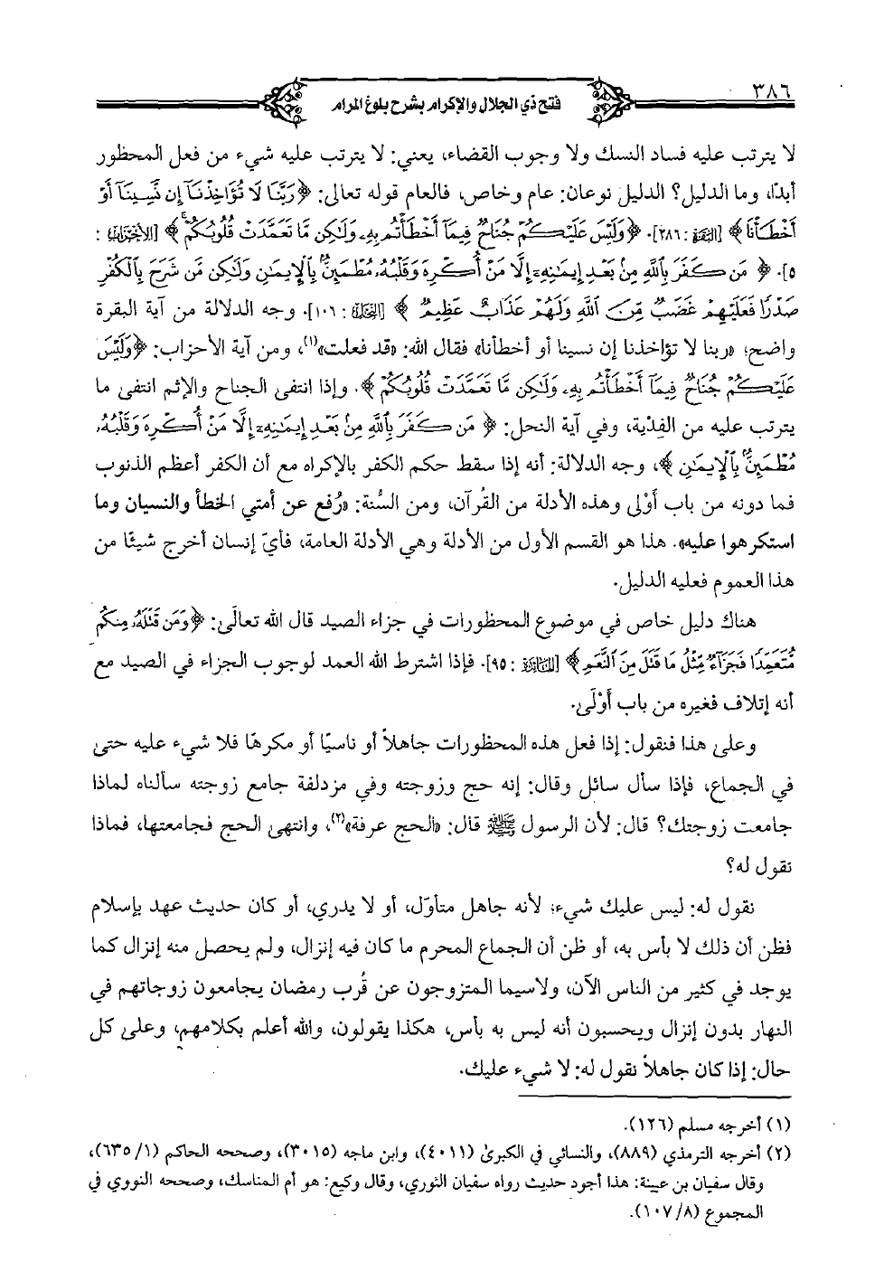 لا يترتب عليه فساد النسك ولا وجوب القضاء، يعني: لا يترتب عليه شيء من فعل المحظور أبدًا، وما الدليل؟ الدليل نوعان: عام وخاص، فالعام قوله تعالى: {رَبَّنَا لا تُؤَاخِذْنَا إن نَّسِينَا أَوْ أَخْطَأْنَا} [البقرة: 286]. {ولَيْسَ عَلَيْكُمْ جُنَاحٌ فِيمَا أَخْطَأْتُم بِهِ ولَكِن مَّا تَعَمَّدَتْ قُلُوبُكُمْ} [الأحزاب: 5]. {مَن كَفَرَ بِاللَّهِ مِنْ بَعْدِ إيمَانِهِ إلاَّ مَنْ أُكْرِهَ وقَلْبُهُ مُطْمَئِنٌّ بِالإيمَانِ ولَكِن مَّن شَرَحَ بِالْكُفْرِ صَدْرًا فَعَلَيْهِمْ غَضَبٌ مِّنَ اللَّهِ ولَهُمْ عَذَابٌ عَظِيمٌ} [النحل: 106]. وجه الدلالة من آية البقرة واضح، " رَبَّنَا لا تُؤَاخِذْنَا إن نَّسِينَا أَوْ أَخْطَأْنَا" فقال الله: "قد فعلت"، ومن آية الأحزاب: {ولَيْسَ عَلَيْكُمْ جُنَاحٌ فِيمَا أَخْطَأْتُم بِهِ ولَكِن مَّا تَعَمَّدَتْ قُلُوبُكُمْ}. وإذا انتفى الجناح والإثم انتفى ما يترتب عليه من الفدية، وفي آية النحل: {مَن كَفَرَ بِاللَّهِ مِنْ بَعْدِ إيمَانِهِ إلاَّ مَنْ أُكْرِهَ وقَلْبُهُ مُطْمَئِنٌّ بِالإيمَانِ}، وجه الدلالة: أنه إذا سقط حكم الكفر بالإكراه مع أن الكفر أعظم الذنوب فما دونه من باب أولى وهذه الأدلة من القرآن، ومن السنة: "رفع عن أمتي الخطأ والنسيان وما استكرهوا عليه". هذا هو القسم الأول من الأدلة وهي الأدلة العامة، فأي إنسان أخرج شيئًا من هذا العموم فعليه الدليل.