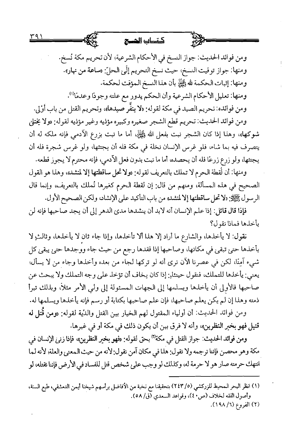 ومنها: أن لقطة الحرم لا تملك بالتعريف لقوله: "ولا تحل ساقطتها إلا لمنشد"، وهذا هو القول الصحيح في هذه المسألة، ومنهم من قال: إن لقطة الحرم كغيرها تملك بالتعريف، وإنما قال الرسول صلى الله عليه وسلم: "لا تحل ساقطتها إلا لمنشد" من باب التأكيد على الإنشاد، ولكن الصحيح الأول.