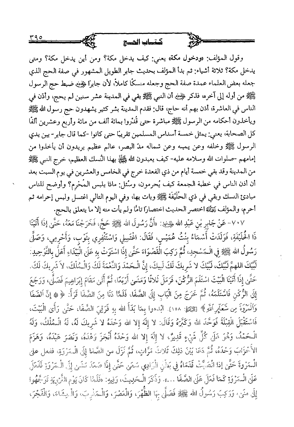 وقول المؤلف: "ودخول مكة" يعني: كيف يدخل مكة؟ ومن أين يدخل مكة؟ ومتى يدخل مكة؟ ثلاثة أشياء: ثم بدأ المؤلف بحديث جابر الطويل المشهور في صفة الحج الذي جعله بعض العلماء عمدة صفة الحج وجعله منسكًا كاملًأ؛ لأن جابرًا رضي الله عنه ضبط حج الرسول صلى الله عليه وسلم من أوله إلى آخره، فذكر رضي الله عنه أن النبي صلى الله عليه وسلم بقي في المدينة عشر سنين لم يحج، وأذن في الناس في العاشرة، إذن بهم أنه حاج، قال: فقدم المدينة بشر كثير يشهدون حج رسول الله صلى الله عليه وسلم ويأخذون أحكامه من الرسول صلى الله عليه وسلم مباشرة حتى قدروا بمائة ألف من مائة وأربع وعشرين ألفًا كل الصحابة، يعني: يمثل خمس أسداس المسلمين تقريبًا حتى كانوا -كما قال جابر- بين يدي الرسول صلى الله عليه وسلم وخلفه وعن يمينه وعن شماله مد البصر، عالم عظيم يريدون أن يأخذوا من إمامهم -صلوات الله وسلامه عليه- كيف يعبدون الله عز وجل بهذا النسك العظيم، خرج النبي صلى الله عليه وسلم من المدينة وقد بقى خمسة أيام من ذي القعدة خرج في الخامس والعشرين في يوم السبت بعد أن أذن الناس في خطبة الجمعة كيف يحرمون، وسئل: ماذا يلبس المحرم؟ وأوضح للناس مبادئ النسك وبقي في ذي الحليفة صلى الله عليه وسلم وبات بها، وفي اليوم التالي اغتسل ولبس إحرامه ثم أحرم، والمؤلف رحمه الله اختصر الحديث اختصارًا تامًا ولم يأت منه إلا ما يتعلق بالحج.