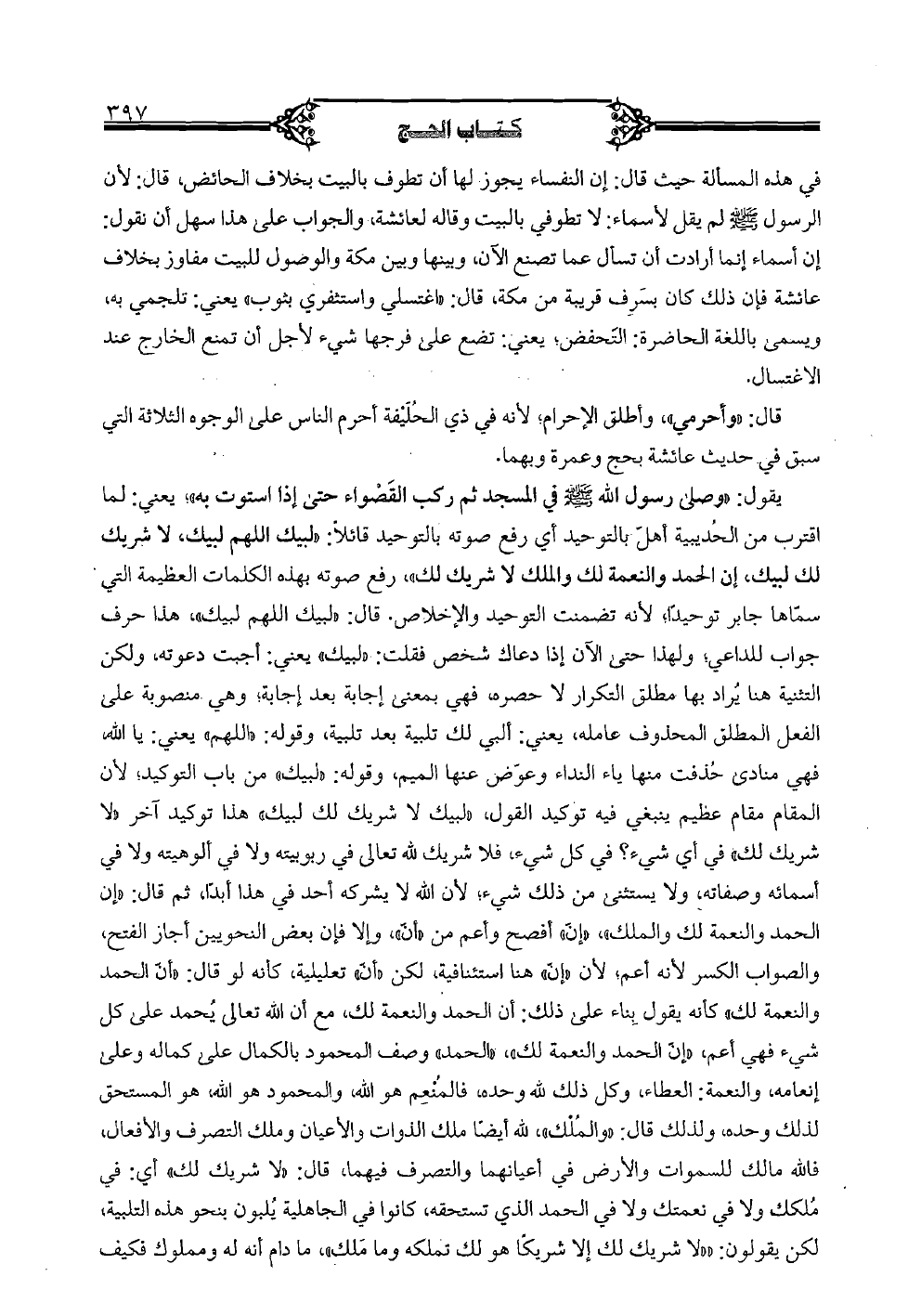 يقول: "وصلى رسول الله صلى الله عليه وسلم في المسجد ثم ركب القصواء حتى إذا استوت به"؛ يعني: لما اقترب من الحديبية أهلّ بالتوحيد أي رفع صوته بالتوحيد قائلاً: "لبيك اللهم لبيك، لا شريك لك لبيك، إن الحمد والنعمة لك والملك لا شريك لك"، رفع صوته بهذه الكلمات العظيمة التي سمّاها جابر توحيدًا؛ لأنه تضمنت التوحيد والإخلاص. قال: "لبيك اللهم لبيك" هذا حرف جواب للداعي؛ ولهذا حتى الآن إذا دعاك شخص فقلت: "لبيك" يعني: أجبت دعوته، ولكن التثنية هنا يراد بها مطلق التكرار لا حصره، فهي بمعنى إجابة بعد إجابة؛ وهي منصوبة على الفعل المطلق المحذوف عامله، يعني: ألبي لك تلبية بعد تلبية، وقوله: "اللهم" يعني: يا الله، فهي منادى حذفت منها ياء النداء وعوض عنها الميم، وقوله: "لبيك" من باب التوكيد؛ لأن المقام مقام عظيم ينبغي فيه توكيد القول، "لبيك لا شريك لك لبيك" هذا توكيد آخر "لا شريك لك" في أي شيء؟ في كل شيء، فلا شريك لله تعالى في ربوبيته ولا في ألوهيته ولا في أسمائه وصفاته، ولا يستثنى من ذلك شيء؛ لأن الله لا يشركه أحد في هذا أبدًا، ثم ثال: "إن الحمد والنعمة لك والملك"، "إنّ" أفصح وأعم من "أنّ" وإلا فإن بعض النحويين أجاز الفتح، والصواب الكسر لأنه أعم؛ لأن "إنّ" هنا اسئنافية، لكن "أنّ" تعليلية، كأنه لو قال: "أنّ الحمد والنعمة لك" كأنه يقول بناء على ذلك: أن الحمد والنعمة لك، مع أن الله تعالى يحمد على كل شيء فهي أعم، "إنّ الحمد والنعمة لك"، "الحمد" وصف المحمود بالكمال على كماله وعلى إنعامه، والنعمة: العطاء، وكل ذلك لله وحده، فالمنعم هو الله، والمحمود هو الله، هو المستحق لذلك وحده، ولذلك قال: "والملك"، لله أيضًا ملك الذوات والأعيان وملك التصرف والأفعال، فالله مالك للسموات والأرض في أعيانها والتصرف فيهما، قال: "لا شريك لك" أي: في ملكك ولا في نعمتك ولا في الحمد الذي تستحقه، كانوا في الجاهلية يلبون بنحو هذه التلبية، لكن يقولون: "لا شريك لك إلا شريكًا هو لك تملكه وما ملك"، ما دام أنه له ومملوك فكيف