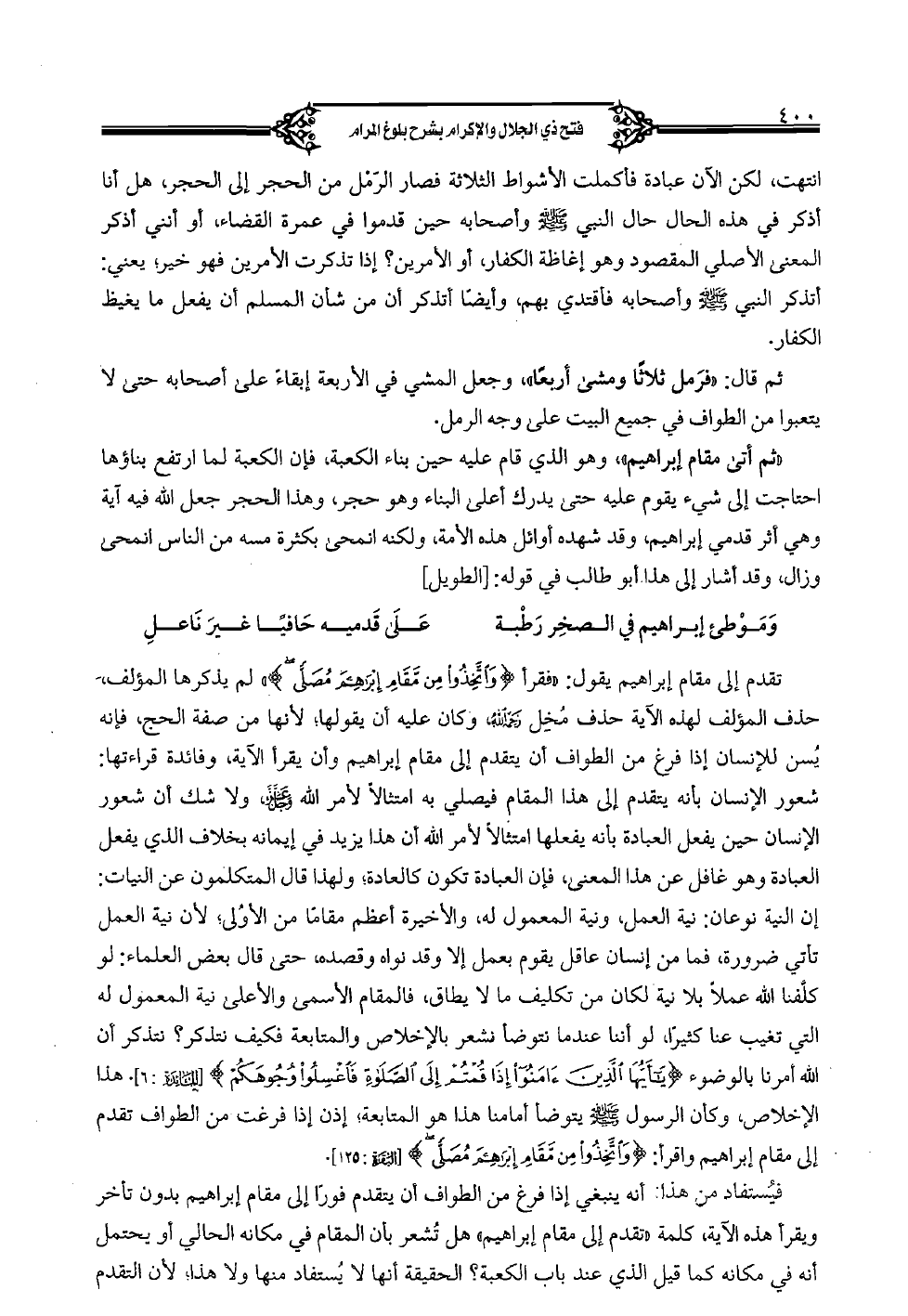 تقدم إلى مقام إبراهيم يقول: "فقرأ {وَاتَّخِذُوا مِنْ مَقَامِ إِبْرَاهِيمَ مُصَلًّى} " لم يذكرها المؤلف، حذف المؤلف لهذه الآية حذف مخل رحمه الله، وكان عليه أن يقولها؛ لأنها من صفة الحج، فإنه يسن للإنسان إذا فرغ من الطواف أن يتقدم إلى مقام إبراهيم وأن يقرأ الآية، وفائدة قراءتها: شعور الإنسان بأنه يتقدم إلى هذا المقام فيصلي به امتثالاً لأمر الله عز وجل، ولا شك أن شعور الإنسان حين يفعل العبادة بأنه يفعلها امتثالاً لأمر الله أن هذا يزيد في إيمانه بخلاف الذي يفعل العبادة وهو غافل عن هذا المعنى، فإن العبادة تكون كالعادة؛ ولهذا قال المتكلمون عن النيات: إن النية نوعان: نية العمل، ونية المعمول له، والأخيرة أعظم مقامًا من الأولى، لأن نية العمل تأتي ضرورة، فما من إنسان عاقل يقوم بعمل إلا وقد نواه وقصده، حتى قال بعض العلماء: لو كلَّفنا الله عملاً بلا نية لكان من تكليف ما يطاق، فالمقام الأسمى والأعلى نية المعمول له التي تغيب عنا كثيرًا، لو أننا عندما نتوضأ نشعر بالإخلاص والمتابعة فكيف نتذكر؟ نتذكر أن الله أمرنا بالوضوء {يَا أَيُّهَا الَّذِينَ آَمَنُوا إِذَا قُمْتُمْ إِلَى الصَّلَاةِ فَاغْسِلُوا وُجُوهَكُمْ} [المائدة: 6]. هذا الإخلاص، وكأن الرسول صلى الله عليه وسلم يتوضأ أمامنا هذا هو المتابعة؛ إذن إذا فرغت من الطواف تقدم إلى مقام إبراهيم واقرأ: {وَاتَّخِذُوا مِنْ مَقَامِ إِبْرَاهِيمَ مُصَلًّى} [البقرة: 125].