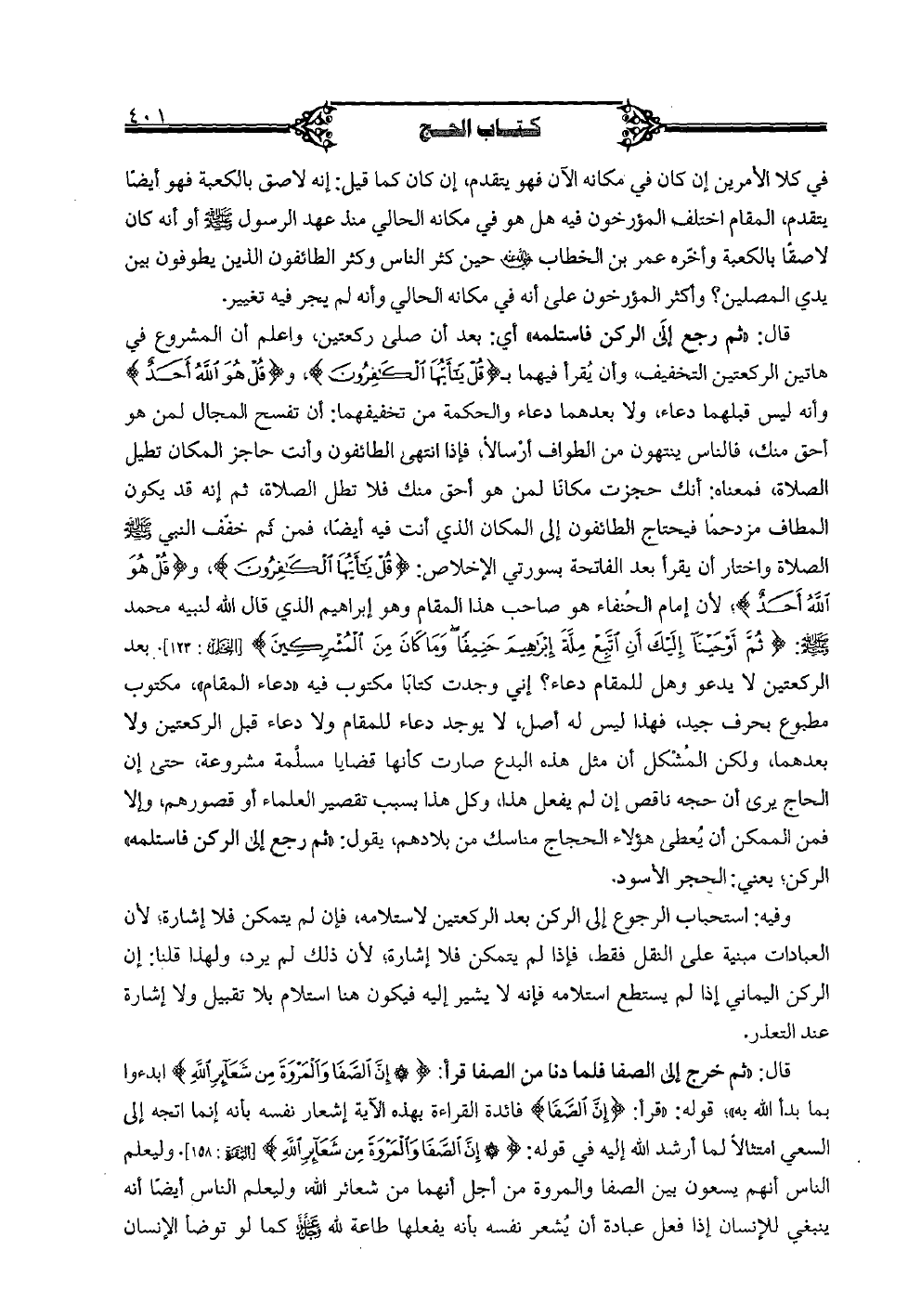 قال: "ثم رجع إلى الركن فاستلمه" أي: بعد أن صلى ركعتين، واعلم أن المشروع في هاتين الركعتين التخفيف، وأن يقرأ فيهما بـ {قُلْ يَا أَيُّهَا الْكَافِرُونَ}، و {قُلْ هُوَ اللَّهُ أَحَدٌ} وأنه ليس قبلهما دعاء، ولا بعدهما دعاء والحكمة من تخفيفهما: أن تفسح المجال لمن هو أحق منك، فالناس ينتهون من اطواف أرسالاً، فإذا انتهى الطائفون وأنت حاجز المكان تطيل الصلاة، فمعناه: أنك حجزت مكانًا لمن هو أحق منك فلا تطل الصلاة، ثم إنه قد يكون المطاف مزدحمًا فيحتاج الطائفون إلى المكان الذي أنت فيه أيضًا، فمن ثم خفف النبي صلى الله عليه وسلم الصلاة واختار أن يقرأ بعد الفاتحة بسورتي الإخلاص: {قُلْ يَا أَيُّهَا الْكَافِرُونَ}، و {قُلْ هُوَ اللَّهُ أَحَدٌ}؛ لأن إمام الحنفاء هو صاحب هذا المقام وهو إبراهيم الذي قال الله لنبيه محمد صلى الله عليه وسلم: {ثُمَّ أَوْحَيْنَا إِلَيْكَ أَنِ اتَّبِعْ مِلَّةَ إِبْرَاهِيمَ حَنِيفًا وَمَا كَانَ مِنَ الْمُشْرِكِينَ} [النحل: 123]. بعد الركعتين لا يدعو وهل للمقام دعاء؟ إني وجدت كتابًا مكتوب فيه "دعاء المقام"، مكتوب مطبوع بحرف جيد، فهذا ليس له أصل، لا يوجد دعاء للمقام ولا دعاء قبل الركعتين ولا بعدهما، ولكن المشكل أن مثل هذه البدع صارت كأنها قضايا مسلمة مشروعة، حتى إن الحاج يرى أن حجه ناقص إن لم يفعل هذا، وكل هذا بسبب تقصير العلماء أو قصورهم، وإلا فمن الممكن أن يعطى هؤلاء الحجاج مناسك من بلادهم، يقول: "ثم رجع إلى الركن فاستلمه" الركن؛ يعني: الحجر الأسود.