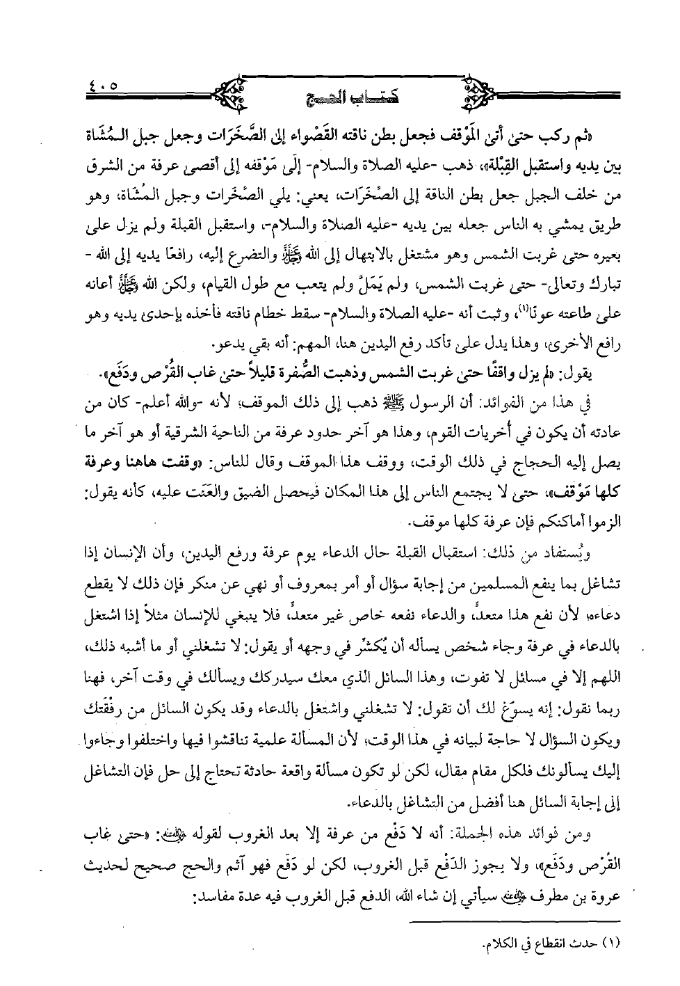 "ثم ركب حتى أتى الموقف فجعل بن ناقته القصواء إلى الصَّخرات وجعل جبل المشاة بين يديه واستقبل القبلة"، ذهب -عليه الصلاة والسلام- إلى موقفه إلى أقصى عرفة من الشرق من خلف الجبل جعل بطن الناقة إلى الصَّخرات، يعني: يلي الصَّخرات وجبل المشاة، وهو طريق يمشي به الناس جعله بين يديه -عليه الصلاة والسلام-، واستقبل القبلة ولم يزل على بعيره حتى غربت الشمس وهو مشتغل بالابتهال إلى الله عز وجل والتضرع إليه، رافعًا يديه إلى الله -تبارك وتعالى- حتى غربت الشمس، ولم يمل ولم يتعب مع طول القيام، ولكن الله عز وجل أعانه على طاعته عونًا، وثبت أنه -عليه الصلاة والسلام- سقط خطام ناقته فأخذه بإحدى يديه وهو رافع الأخرى، وهذا يدل على تأكد رفع اليدين هنا، المهم: أنه بقي يدعو.