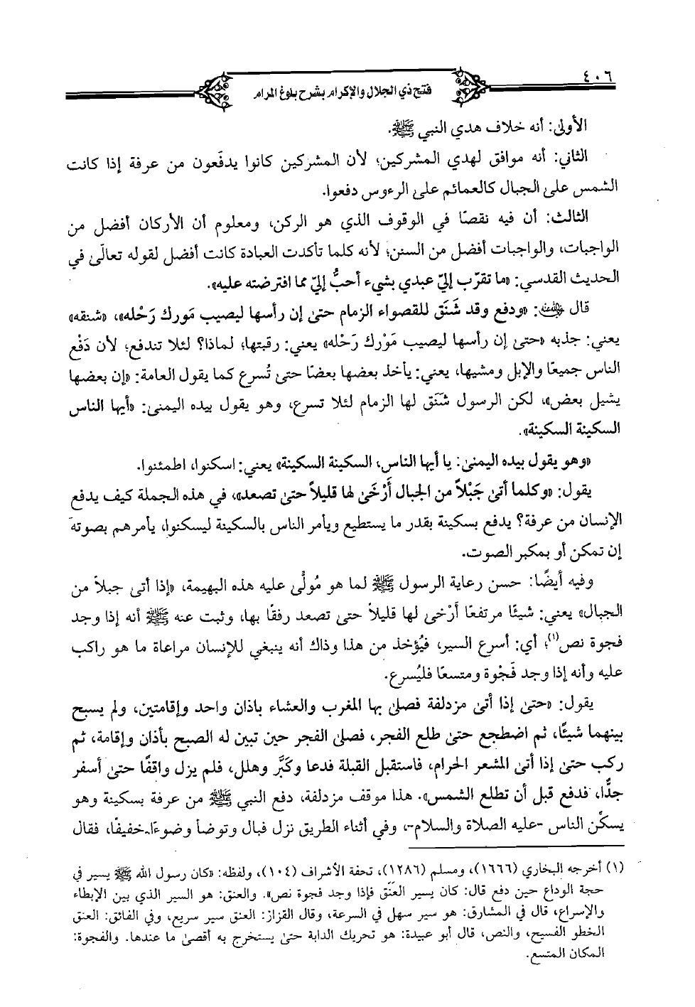 يقول: "وكلما أتى جبلًا من الجبال أرخى لها قليلًا حتى تصعد" في هذه الجملة كيف يدفع الإنسان من عرفة؟ يدفع بسكينة بقدر ما يستطيع ويأمر الناس بالسكينة ليسكنوا، يأمرهم بصوته إن تمكن أو بمكبر الصوت.