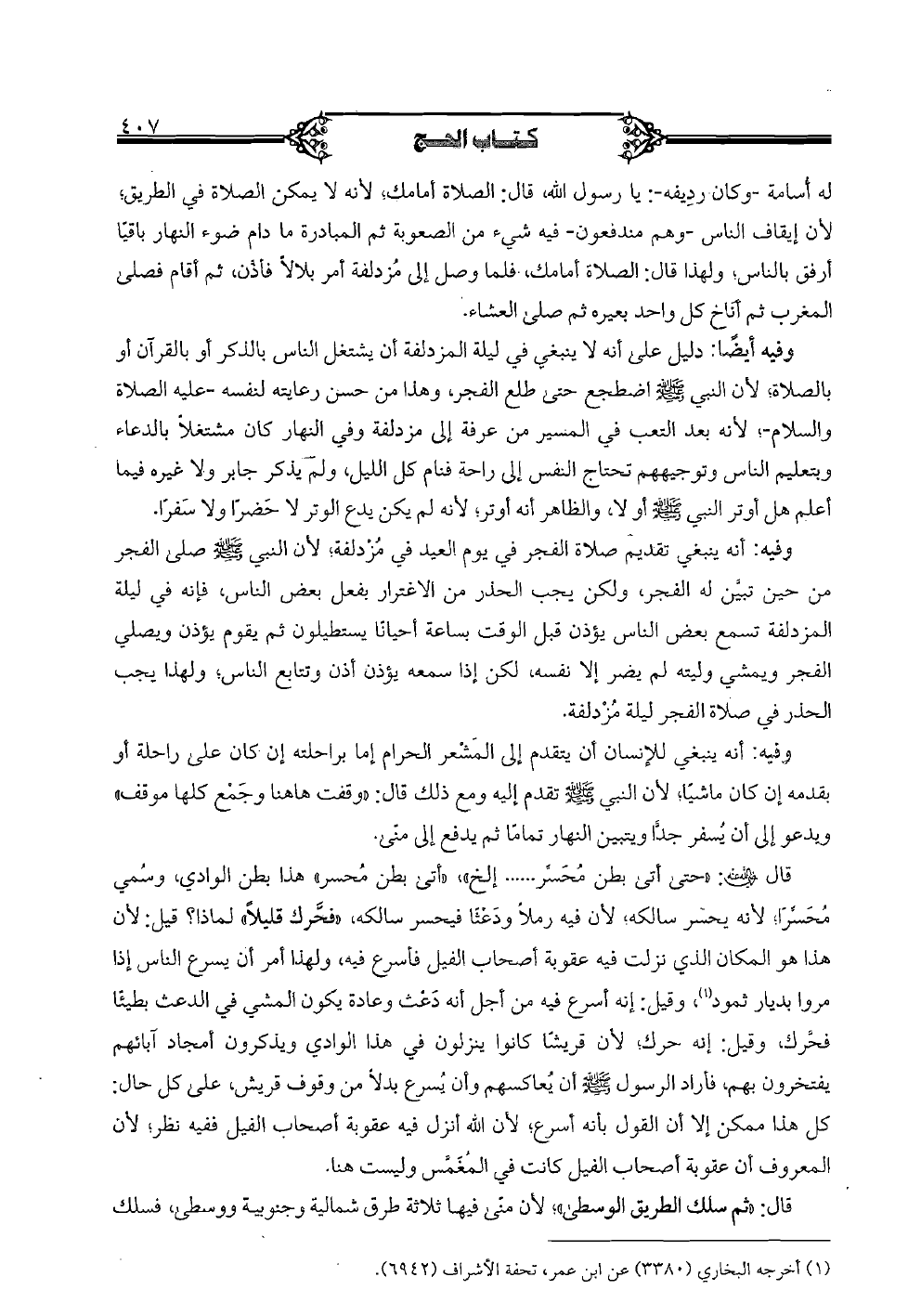 قال رضي الله عنه: "حتى أتى بطن محسر .... الخ" "أتى بطن محسر" هذا بطن الوادي، وسمي محسرا؛ لأ، هـ سالكه؛ لأن فيه رملًا ودعثًا فيحسر سالكه، "فحَّرك قليلًا" لماذا؟ قيل: لأن هذا هو المكان الذي نزلت فيه عقوبة أصحاب الفيل فأسرع فيه، ولهذا أمر أن يسرع الناس إذا مروا بديار ثمود، وقيل: إنه أسرع فيه من أجل أنه دعث وعادة يكون المشي في الدعث بطيئًا فحَّرك، وقيل: إنه حرك؛ لأن قريشًا كانوا ينزلون في هذا الوادي ويذكرون أمجاد آبائهم يفتخرون بهم، فأراد الرسول صلى الله عليه وسلم أن يعاكسهم وأن يسرع بدلاً من وقوف قريش، على كل حال: كل هذا ممكن إلا أن القول بأنه أسرع؛ لأن الله أنزل فيه عقوبة أصحاب الفيل كانت في المغمَّس وليست هنا.