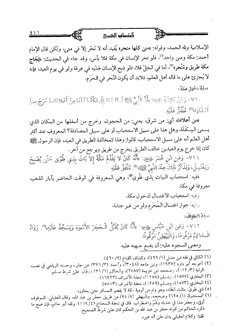 711 - وعن ابن عمر رضي الله عنه: "أنه كان لا يقدم مكة إلا بات بذي طوى حتى يصبح ويغتسل، ويذكر ذلك عند النبي صلى الله عليه وسلم" متفق عليه.