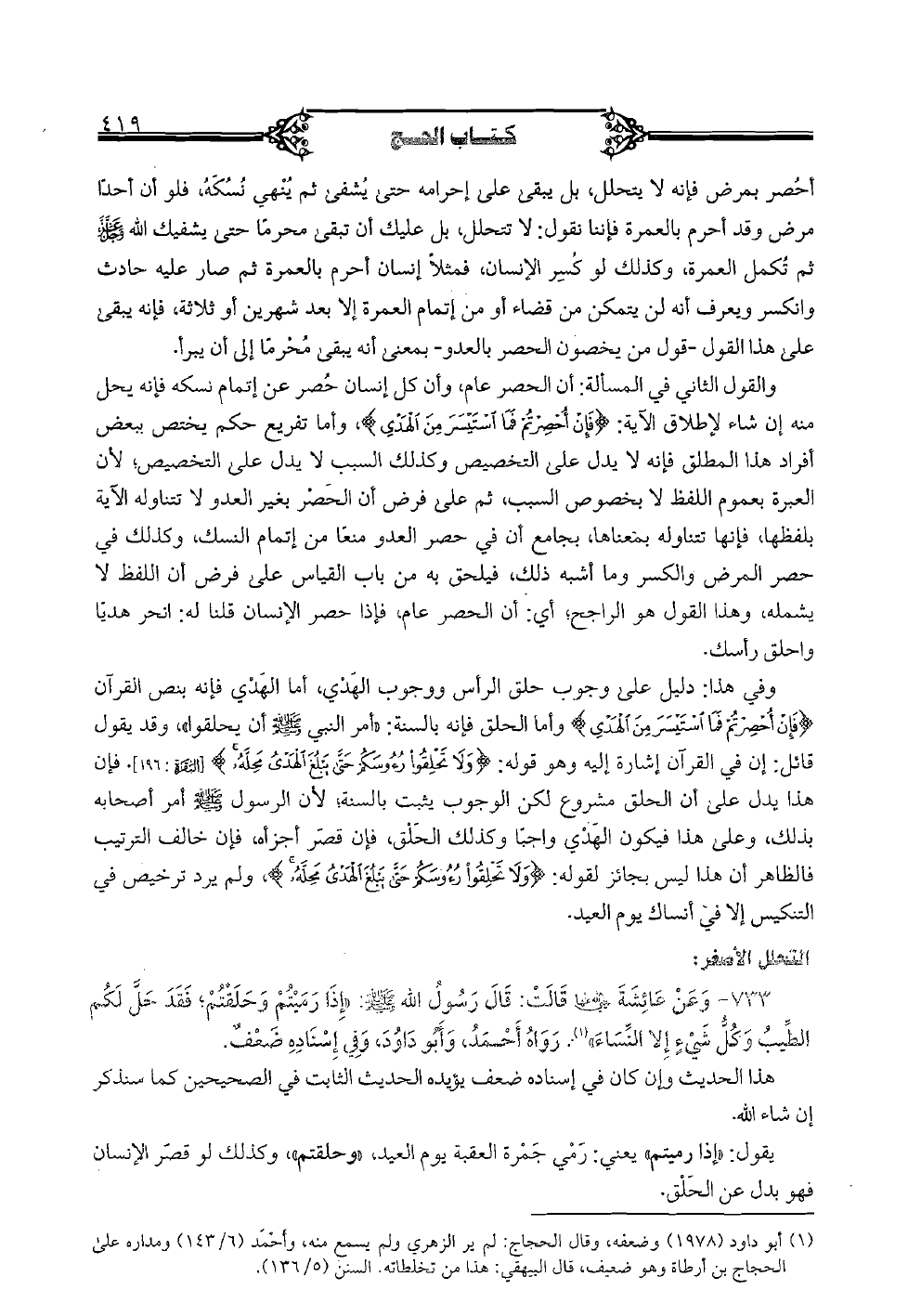 733 - وعن عائشة رضي الله عنها قالت: قال رسول الله صلى الله عليه وسلم: "إذا رميتم وحلقتم؛ فقد حلَّ لكم الطيب وكل شيءٍ إلا النساء". رواه أحمد، وأبو داود، وفي إسناده ضعف.