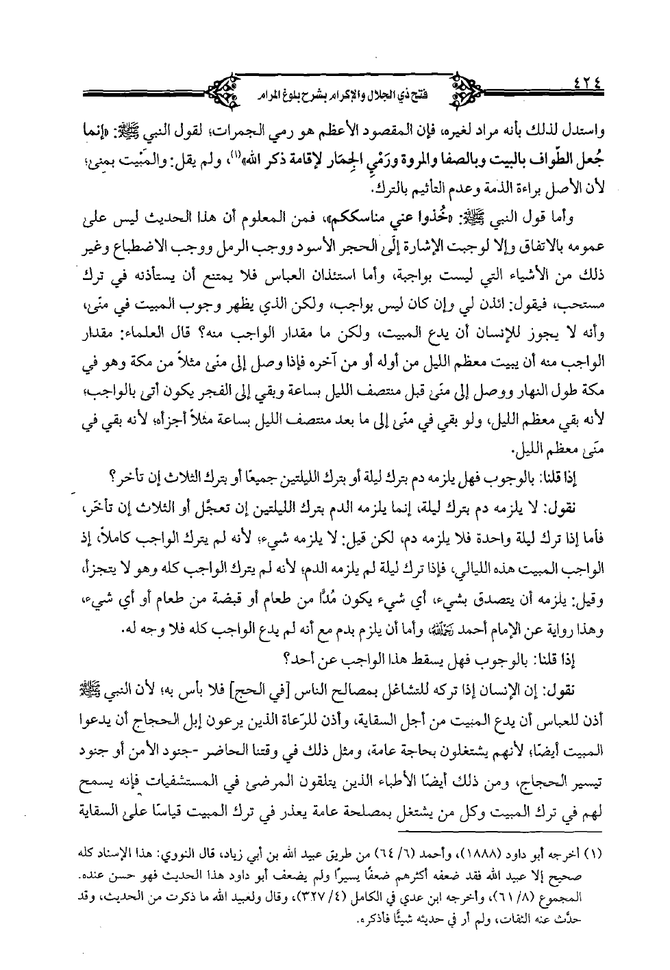 وأما قول النبي صلى الله عليه وسلم: "خذوا عني مناسككم"، فمن المعلوم أن هذا الحديث ليس على عمومه بالاتفاق وإلا لوجبت الإشارة إلى الحجر الأسود ووجب الرمل ووجب الاضطباع وغير ذلك من الأشياء التي ليست بواجبة، وأما استئذان العباس فلا يمتنع أن يستأذنه في ترك مستحب، فيقول: ائذن لي وإن كان ليس بواجب"، ولكن الذي يظهر وجوب المبيت في منًى، وأنه لا يجوز للإنسان أن يدع المبيت، ولكن ما مقدار الواجب منه؟ قال العلماء: مقدار الواجب منه أن يبيت معظم الليل من أوله أو من آخره فإذا وصل إلى منى مثلًا من مكة وهو في مكة طول النهار ووصل إلى منى قبل منتصف الليل بساعة وبقي إلى الفجر يكون أتى بالواجب؛ لأنه بقي معظم الليل، ولو بقي في منى إلى ما بعد منتصف الليل بساعة مثلًا أجزأه؛ لأنه بقي في منى معظم الليل.