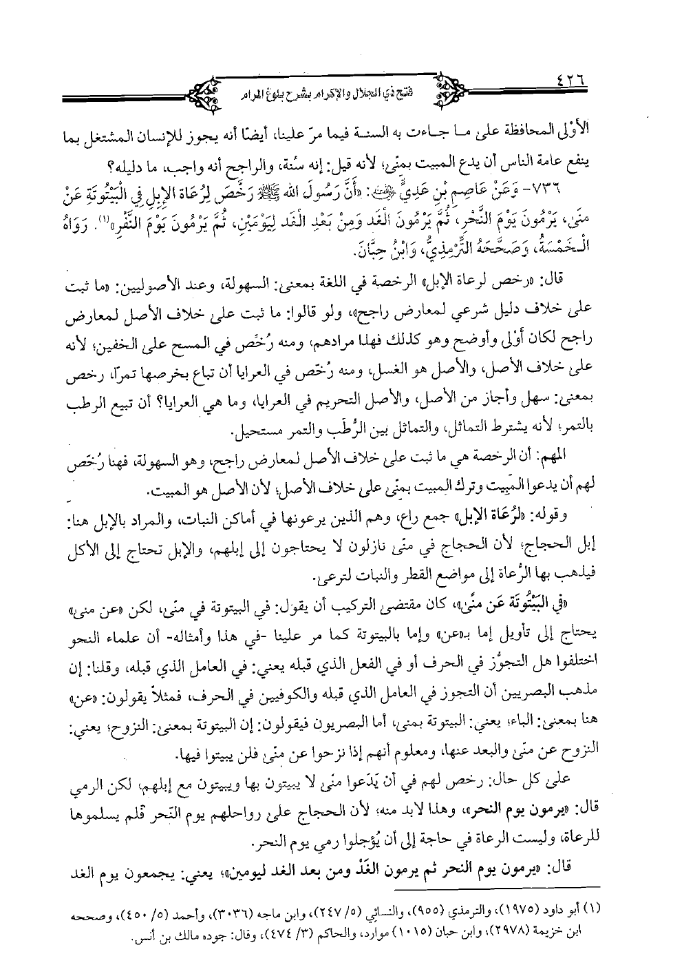 736 - وعن عاصم بن عديٍّ رضي الله عنه: "أنًّ رسول الله صلى الله عليه وسلم رخَّص لرعاة الإبل في البيتوتة عن منى، يرمون يوم النَّحر، ثمَّ يرمون الغد ومن بعد الغد ليومين، ثمَّ يرمون يوم النَّفر.". رواه الخمسة، وصحَّحه التِّرمذيُّ، وابن حبَّان.