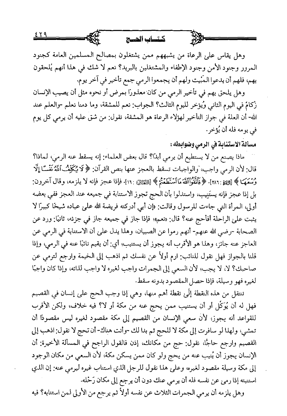 ماذا يصنع من لا يستطيع أن يرمي أبدًا؟ قال بعض العلماء: إنه يسقط عنه الرمي؛ لماذا؟ قال: لأن الرمي واجب، والواجبات تسقط بالعجز عنها بنص القرآن: {لا يكلِّف الله نفسًا إلَّا وسعها} [البقرة: 286]. {فاتَّقوا الله ما استطعتم} [التغابن: 16]. فإذا عجز فإنه لا يلزمه، وقال آخرون: بل إذا عجز فإنه يستنيب، واستدلوا بأن الحج تجوز الاستنابة في جميعه عند العجز ففي بعضه أولى، المرأة التي جاءت للرسول وقالت: "إن أبي أدركته فريضة الله على عباده شيخًا كبيرًا أو يثبت على الراحلة فأحج عنه؟ قال: "نعم"؛ فإذا جاز في جميعه جاز في جزئه، ثانيًا: ورد عن الصحابة - رضي الله عنهم - أنهم رموا عن الصبيان، وهذا يدل على أن الاستنابة في الرمي عن العاجز عنه جائز، وهذا هو الأقرب أنه يجوز أن يستنيب؛ أي: أن يقيم نائبًا عنه في الرمي، وإذا قلنا بالجواز فهل نقول للنائب: ارم أولًا عن نفسك ثم اذهب إلى الخيمة وارجع لترمي عن صاحبك؟ لا، لا يجب؛ لأن السعي إلى الجمرات واجب لغيره لا واجب لذاته، وإذا كان واجبًا لغيره فهو وسيلة، فإذا حصل المقصود بدونه سقط.