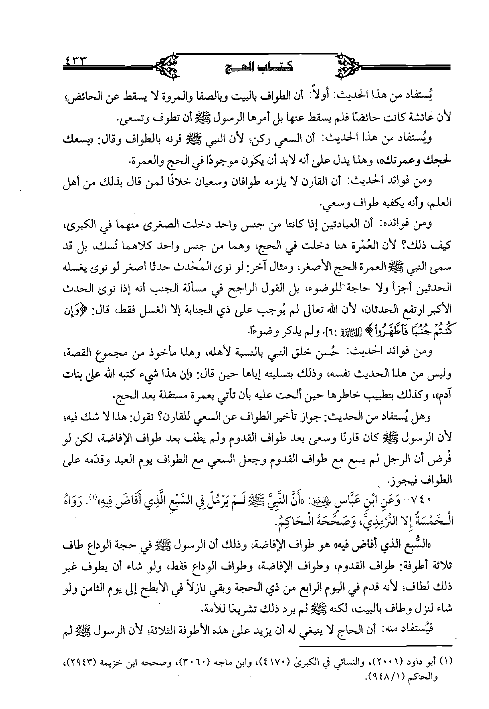 740 - وعن ابن عبَّاس رضي الله عنهما: "أنَّ النَّبي صلى الله عليه وسلم لم يرمل في السَّبع الَّذي أفاض فيه". رواه الخمسة إلا التِّرمذيِّ، وصحَّحه الحاكم.