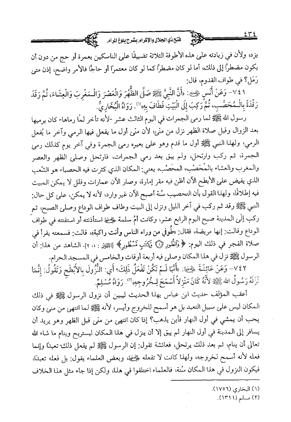 741 - وعن أنس رضي الله عنه: "أنَّ النبيَّ صلَّى الظُّهر والعصر والمغرب والعشاء، ثمَّ رقد رقدةً بالمحصَّب، ثمَّ ركب إلى البيت فطاف به". رواه البخاريُّ.