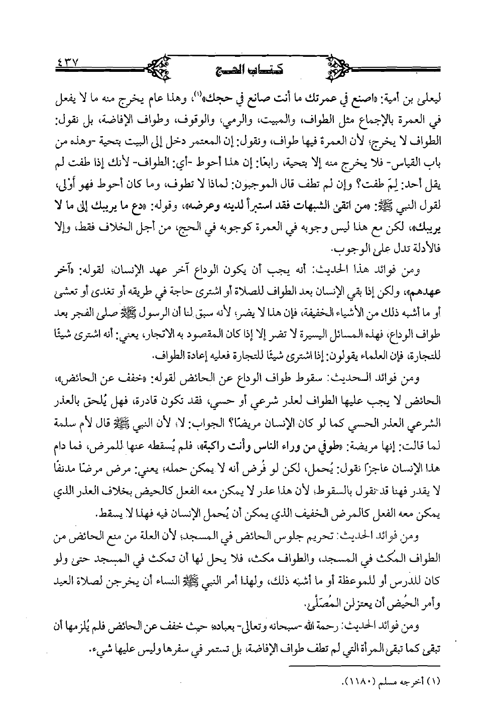 ومن فوائد الحديث: تحريم جلوس الحائض في المسجد؛ لأن العلة من منع الحائض من الطواف المكث في المسجد، والطواف مكث، فلا يحل لها أن تمكث في المسجد حتى لو كان للدرس أو للموعظة أو ما أشبه ذلك، ولهذا أمر النبي صلى الله عليه ولسم النساء أن يخرجن لصلاة العيد وأمر الحيض أن يعتزلن المصلَّى.