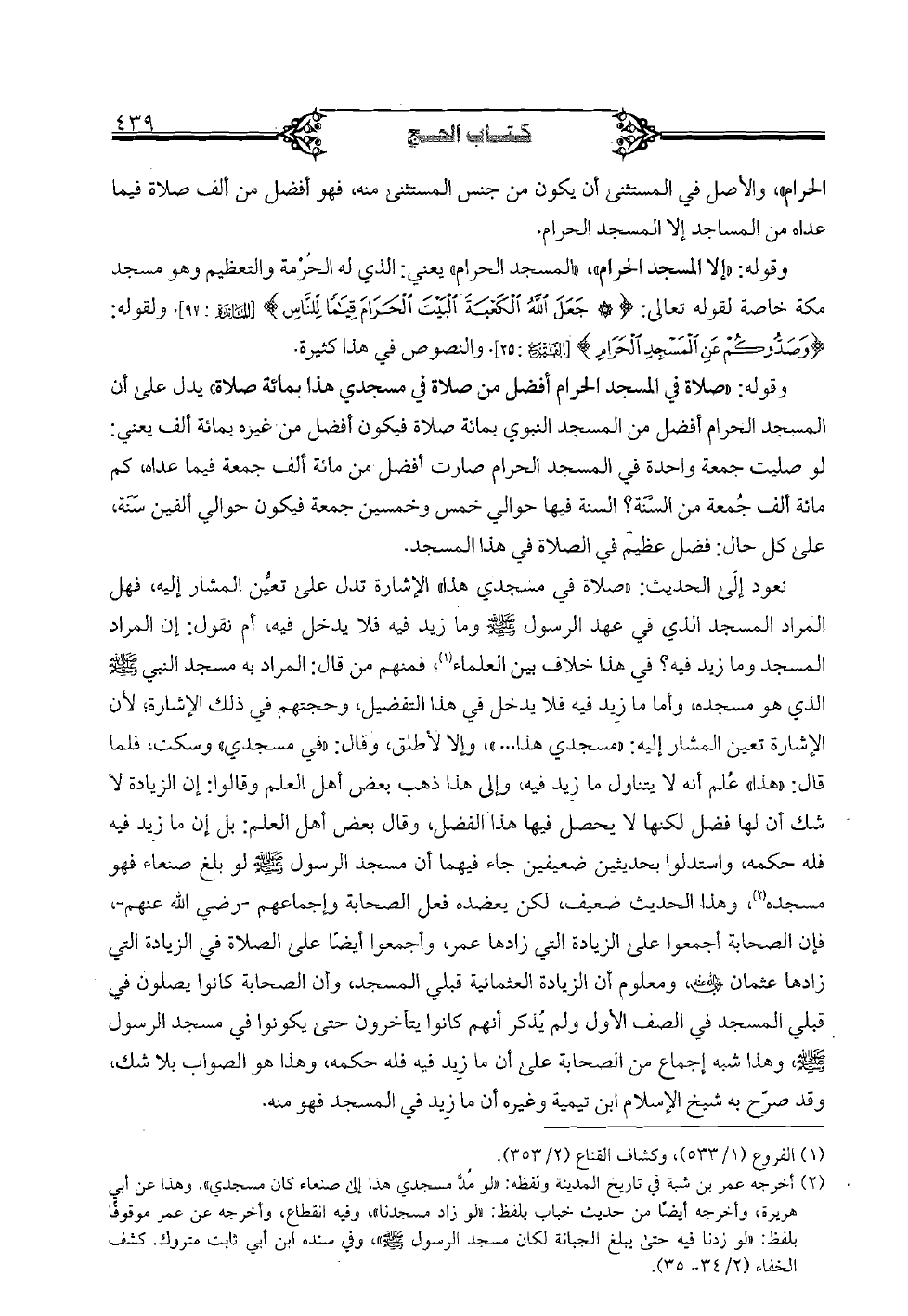 نعود إلى الحديث: "صلاة في مسجدي هذا" الإشارة تدل على تعيُّن المشار إليه، فهل المراد المسجد الذي في عهد الرسول صلى الله عليه وسلم وما زيد فيه فلا يدخل فيه، أم نقول: إن المراد المسجد وما زيد فيه؟ في هذا خلاف بين العلماء؛ فمنهم من قال: المراد به مسجد النبي صلى الله عليه وسلم الذي هو مسجده، وأما ما زيد فيه فلا يدخل في هذا التفضيل، وحجتهم في ذلك الإشارة؛ لأن الإشارة تعين المشار إليه: "مسجدي هذا ... "، وإلا لأطلق، وقال: "في مسجدي" وسكت، فلما قال: "هذا" علم أنه لا يتناول ما زيد فيه، وإلى هذا ذهب بعض أهل العلم وقالوا: إن الزيادة لا شك أن لها فضل لكنها لا يحصل فيها هذا الفضل، وقال بعض أهل العلم: بل إن ما زيد فيه فله حكمه، واستدلوا بحديثين ضعيفين جاء فيهما أن مسجد الرسول صلى الله عليه وسلم لو بلغ صنعاء فهو مسجده، وهذا الحديث ضعيف، لكن يعضد فعل الصحابة وإجماعهم - رضي الله عنهم -، فإن الصحابة أجمعوا على الزيادة التي زادها عمر، وأجمعوا أيضًا على الصلاة في الزيادة التي زادها عثمان رضي الله عنه، ومعلوم أن الزيادة العثمانية قبلي المسجد، وأن الصحابة كانوا يصلون في قبلي المسجد في الصف الأول ولم يذكر أنهم كانوا يتأخرون حتى يكونوا في مسجد الرسول صلى الله عليه وسلم، وهذا شبه إجماع من الصحابة على أن ما زيد فيه فله حكمه، وهذا هو الصواب بلا شك، وقد صرّح به شيخ الإسلام ابن تيمية وغيره أن ما زيد في المسجد فهو منه.