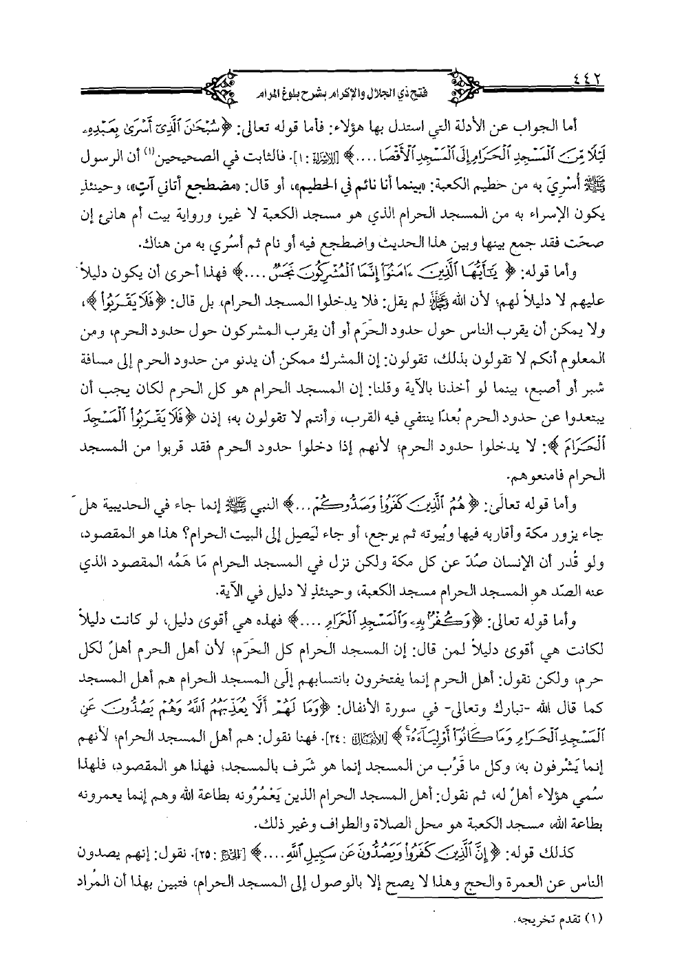وأما قوله تعالى: {وكفر به والمسجد الحرام ... } فهذه هي أقوى دليل، لو كانت دليلًا لكانت هي أقوى دليلًا لمن قال: إن المسجد الحرام كل الحرم؛ لأن أهل الحرم أهل لكل حرم، ولكن نقول: أهل الحرم إنما يفتخرون بانتسابهم إلى المسجد الحرام هم أهل المسجد كما قال الله تعالى - تبارك وتعالى - في سورة الأنفال: {وما لهم ألَّا يعذّبهم الله وهم يصدُّون عن المسجد الحرام وما كانوا أوليآءه} [الأنفال: 34]. فهنا نقول: هم أهم المسجد الحرام؛ لأنهم إنما يشرفون به، وكل ما قرب من المسجد إنما هو شرف بالمسجد؛ فهذا هو المقصود، فلهذا سمي هؤلاء أهل له، ثم نقول: أهل المسجد الحرام الذي يعمرونه بطاعة الله وهم إنما يعمرونه بطاعة الله، مسجد الكعبة هو محل الصلاة والطواف وغير ذلك.