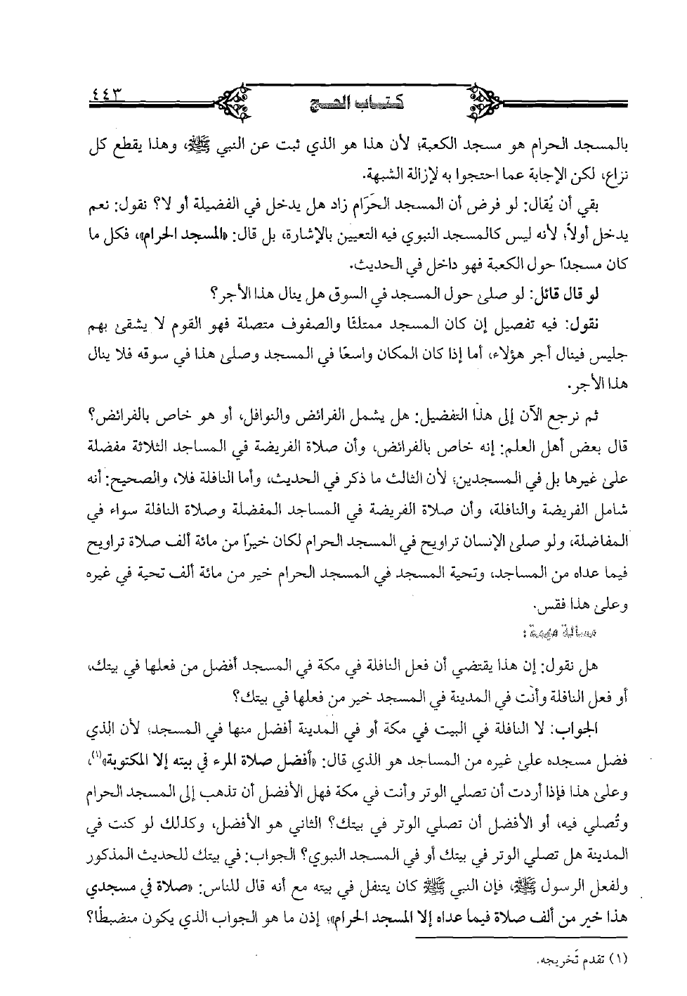 ثم نرجع الآن إلى هذا التفضيل: هل يشمل الفرائض والنوافل، أو هو خاص بالفرائض؟ قال بعض أهل العلم: إنه خاص بالفرائض، وأن صلاة الفريضة في المساجد الثلاثة مفضلة على غيرها بل في المسجدين؛ لأن الثالث ما ذكر في الحديث، وأما النافلة فلا، والصحيح: أنه شامل الفريضة والنافلة، وأن صلاة الفريضة في المساجد المفضلة وصلاة النافلة سواء المفاضلة، ولو صلى الإنسان تراويح في المسجد الحرام لكان خيرًا من مائة ألف صلاة تراويح فيما عداه من المساجد، وتحية المسجد في المسجد الحرام خير من مائة ألف تحية في غيره وعلى هذا فقس.