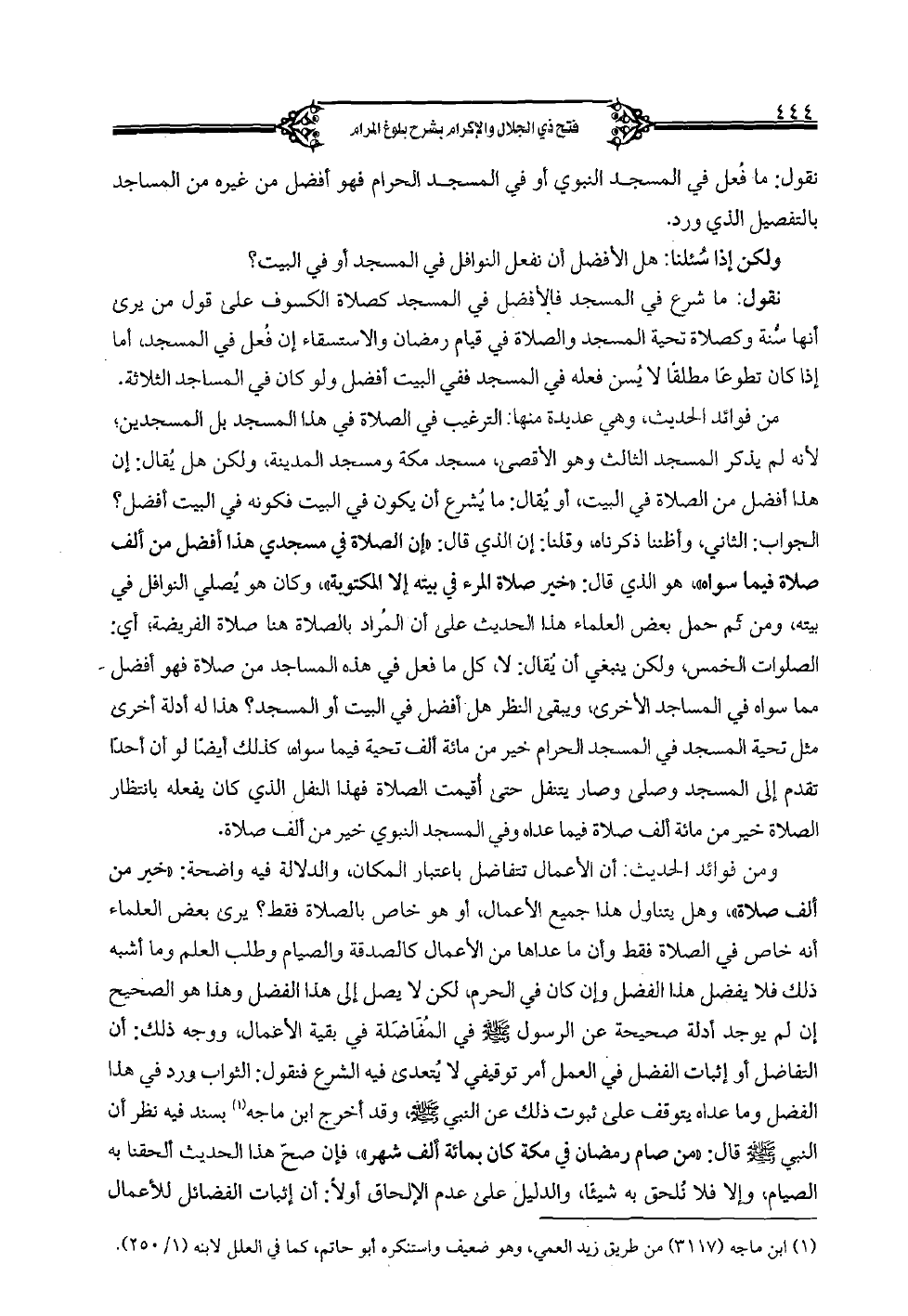 ومن فوائد الحديث: أن الأعمال تتفاضل باعتبار المكان، والدلالة فيه واضحة: "خير من ألف صلاة"، وهل يتناول هذا جميع الأعمال، أو هو خاص بالصلاة فقط؟ يرى بعض العلماء أنه خاص في الصلاة فقط وأن ما عاداها من الأعمال كالصدقة والصيام وطلب العلم وما أشبه ذلك فلا يفضل هذا الفضل وإن كان في الحرم، لكن لا يصل إلى هذا الفضل وهذا هو الصحيح إن لم يوجد أدلة صحيحة عن الرسول صلى الله عليه وسلم في المفاضلة في بقية الأعمال، ووجه ذلك: أن التفاضل أو إثبات الفضل في العمل أمر توقيفي لا يتعدى فيه الشرع فنقول: الثواب ورد في هذا الفضل وما عداه يتوقف على ثبوت ذلك عن النبي صلى الله عليه وسلم، وقد أخرج ابن ماجه بسند فيه نظر أن النبي صلى الله عليه وسلم قال: "من صام رمضان في مكة كان بمائة ألف شهر"، فإن صحّ هذا الحديث ألحقنا به الصيام، وإلا فلا نلحق به شيئًا، والدليل على عدم الإلحاق أولًا: إن إثبات الفضائل للأعمال