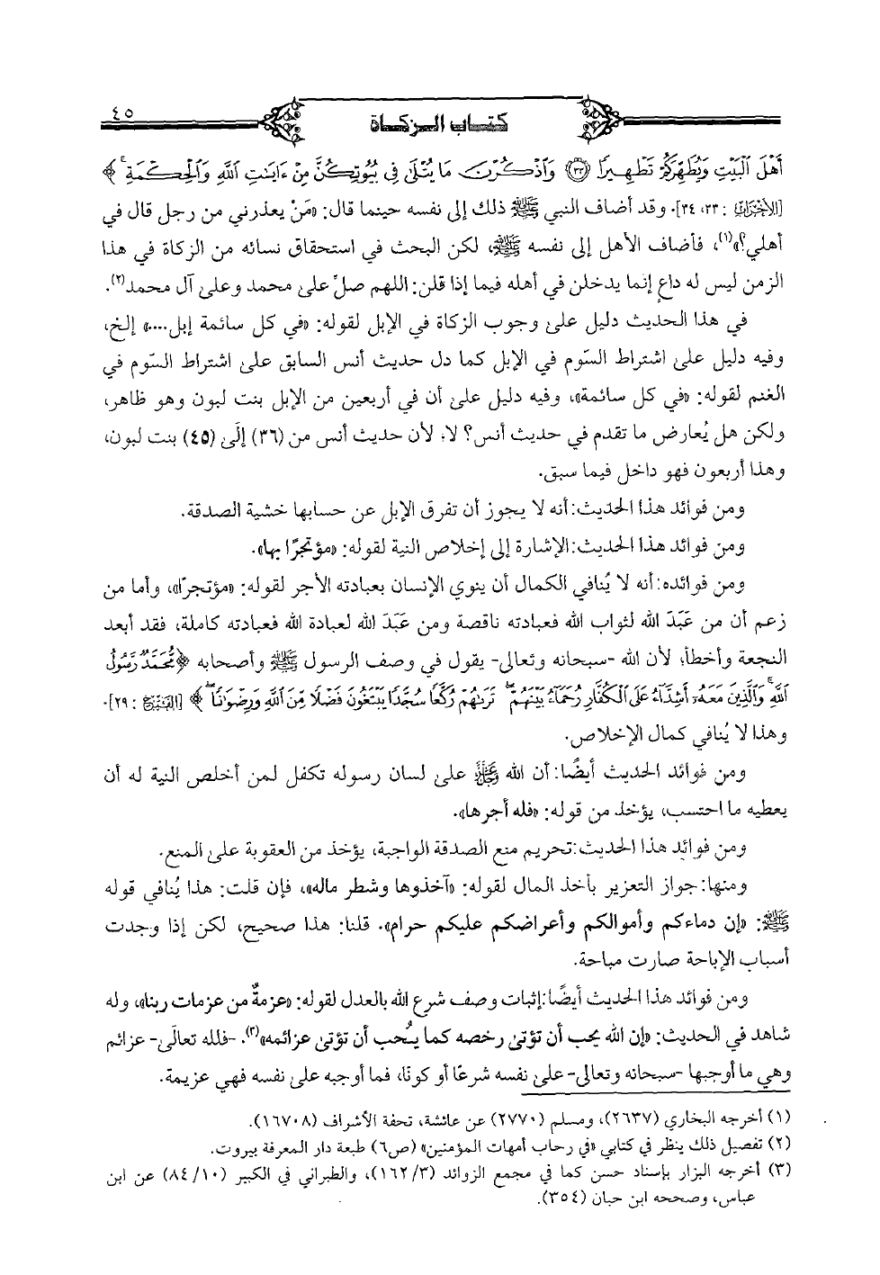 أهل البيت ويطهركم تطهيرًا * واذكرن ما يتلى في بيوتكن من ءايات الله والحكمة} [الأحزاب: 33، 34]. وقد أضاف النبي صلى الله عليه وسلم ذلك إلى نفسه حينما قال: "من يعذرني من رجل قال في أهلي؟ "، فأضاف الأهل إلى نفسه صلى الله عليه وسلم، لكن البحث في استحقاق نسائه من الزكاة في هذا الزمن ليس له داعٍ إنما يدخلن في أهله فيما إذا قلن: اللهم صلِّ على محمد وعلى آل محمد".