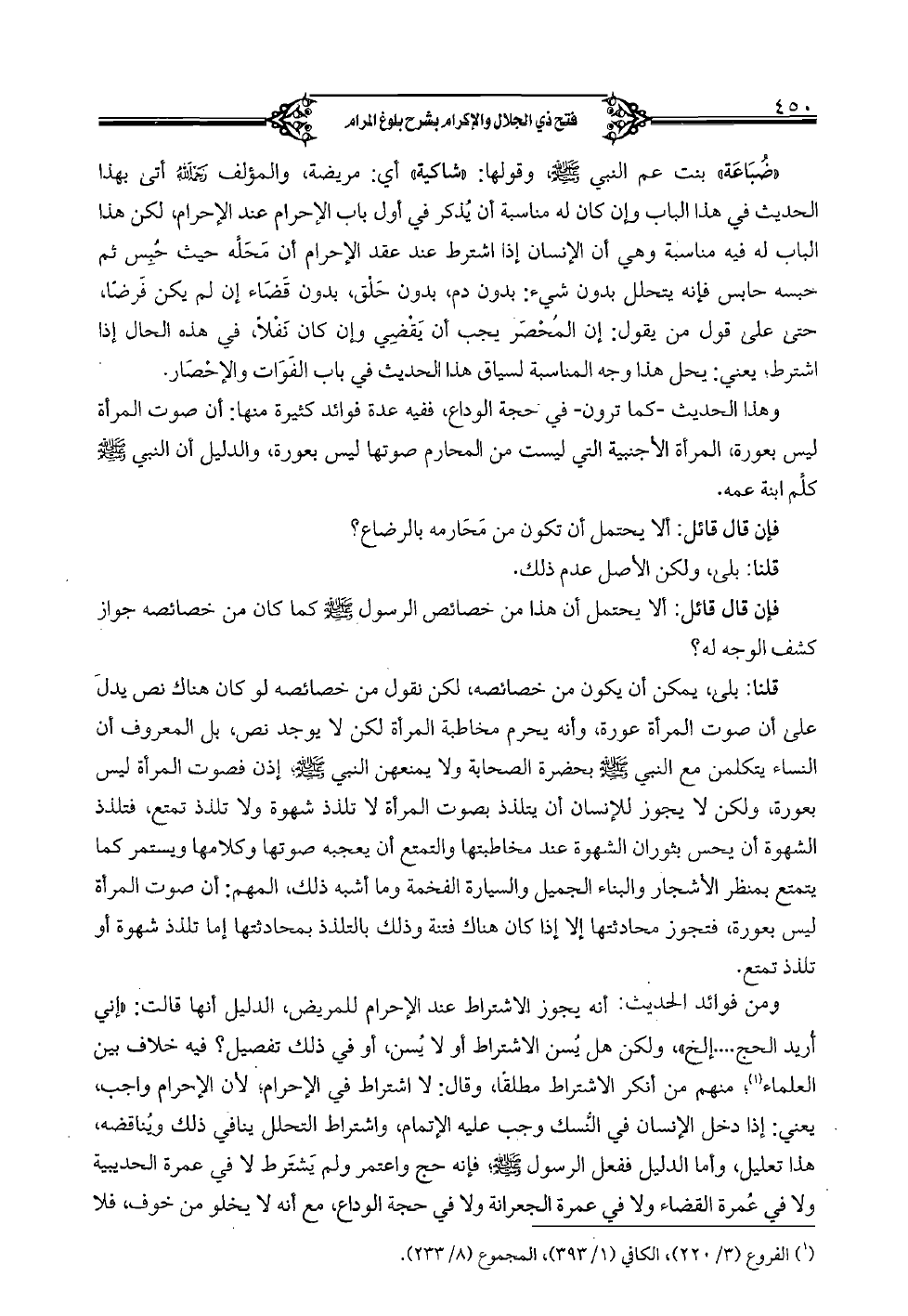 وهذا الحديث -كما ترون -في حجة الوداع، ففيه عدة فوائد كثيرة منها: أن صوت المرأة ليس بعورة، المرأة الأجنبية التي ليست من المحارم صوتها ليس بعورة، والدليل أن النبي صلى الله عليه وسلم كلم ابنة عمه.