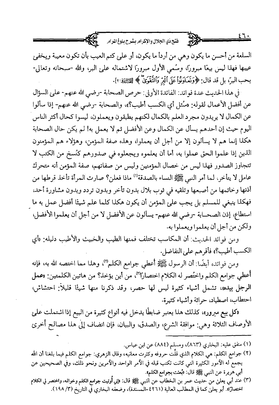 في هذا الحديث عدة فوائد: الفائدة الأولى: حرص الصحابة -رضي الله عنهم -على السؤال عن أفضل الأعمال لقوله: "سئل أي الكسب أطيب؟ "، والصحابة -رضي الله عنهم -إذا سألوا عن الكمال لا يريدون مجرد العلم بالكمال لكنهم يطبقون ويعملون، ليسوا كحال أكثر الناس اليوم حيث إن أحدهم يسأل عن الكمال وعن الأفضل ثم لا يعمل به! لم يكن حال الصحابة هكذا إنما هم لا يسألون إلا من أجل أن يعلموا، وهذه صفة المؤمن، وهؤلاء هم المؤمنون الذين إذا علموا الحق عملوا به، أما أن يعلموه ويجعلوه في صدورهم كنسخ من الكتب لا تتجاوز الصدور فهذا ليس من خصال المؤمنين وليس من صفاتهم، صفة المؤمن أنه متحرك عامل لا يتأخر، لما أمر النبي صلى الله عليه وسلم النساء بالصدقة ماذا فعلن؟ صارت المرأة تأخذ قرطها من أذنها وخاتمها من أصبعها وتلقيه في ثوب بلال بدون تأخر وبدون تردد وبدون مشاورة أحد، فهكذا ينبغي للمسلم بل يجب على المؤمن أن يكون هكذا كلما علم شيئًا أفل عمل به ما استطاع، إذن الصحابة - رضي الله عنهم - يسألون عن الأفضل لا من أجل أن يعلموا الأفضل، ولكن من أجل أن يعلموا ويعلموا به.