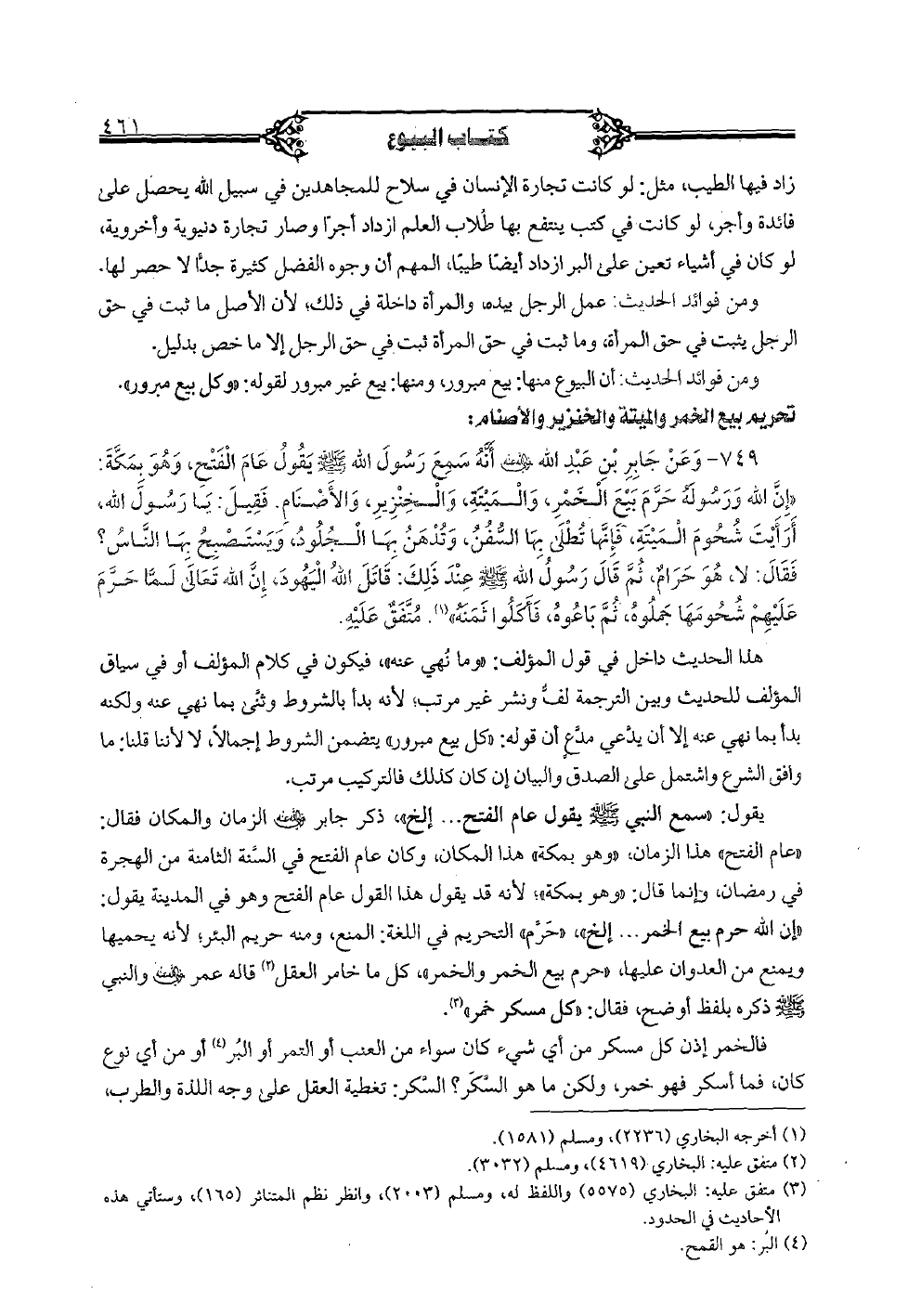 749 - وعن جابر بن عبد الله رضي الله عنه أنَّه سمع رسول الله صلى الله عليه وسلم يقول عام الفتح، وهو بمكَّة: "إنَّ الله ورسوله حرَّم بيع الخمر، والميتة، والخنزير، والأصنام. فقيل: يا رسول الله، أرأيت شحوم الميتة، فإنَّها تطلى بها السُّفن، وتدهن بها الجلود، ويستصبح بها النَّاس؟ فقال: لا، هو حرام، ثمَّ قال رسول الله صلى الله عليه وسلم عند ذلك: قاتل الله اليهود، إن الله تعالى لمَّا حرَّم عليهم شحومها جملوه، ثمَّ باعوه، فأكلوا ثمنه". متَّفق عليه.