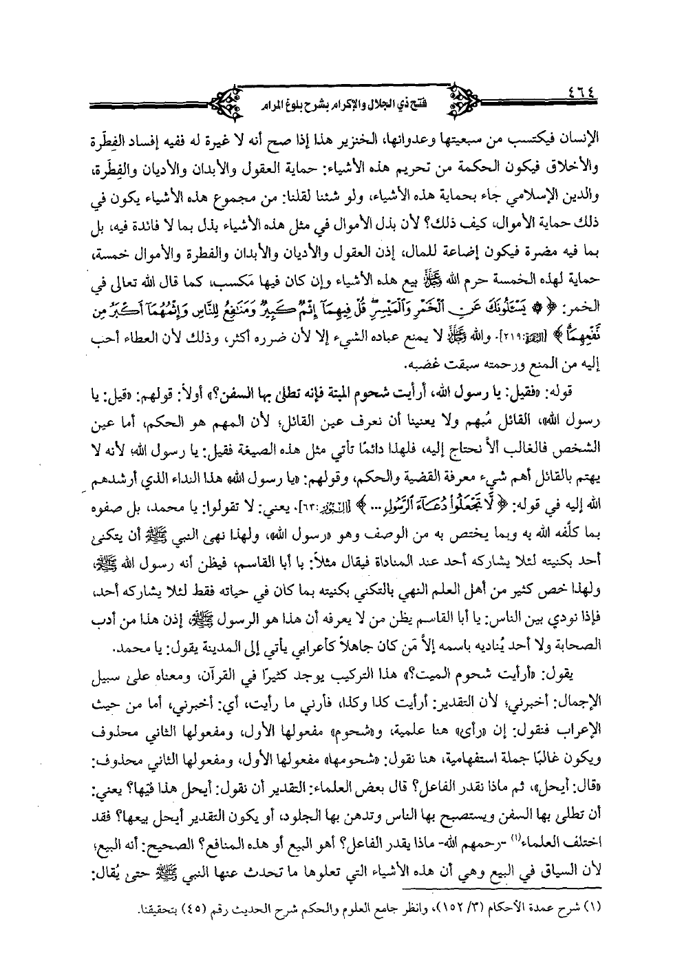 يقول: "أرأيت شحوم الميت؟ " هذا التركيب يوجد كثيرًا في القرآن، ومعناه على سبيل الإجمال: أخبرني؛ لأن التقدير: أرأيت كذا وكذا، فأرني ما رأيت، أي: أخبرني، أما من حيث الإعراب فنقول: إن "رأى" هنا علمية، و"شحوم" مفعولها الأول، ومفعولها الثاني محذوف ويكون غالبًا جملة استفهامية، هنا نقول: "شحومها" مفعولها الأول، ومفعولها الثاني محذوف: "قال: أيحل"، ثم ماذا نقدر الفاعل؟ قال بعض العلماء: التقدير أن نقول: أيحل هذا فيها؟ يعني: أن تطلى بها السفن ويستصبح بها الناس وتدهن بها الجلود، أو يكون التقدير أحيل بيعها؟ فقد اختلف العلماء - رحمهم الله - ماذا يقدر الفاعل؟ أو البيع أو هذه المنافع؟ الصحيح: أنه البيع؛ لأن السياق في البيع وهي أن هذه الأشياء التي تعلوها ما تحدث عنها النبي صلى الله عليه وسلم حتى يقال: