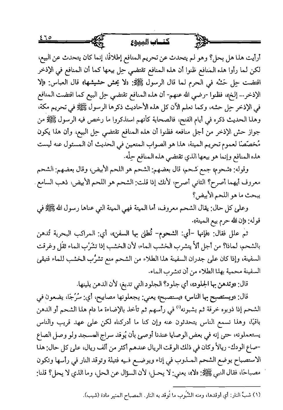 أرأيت هذا هل يحل؟ وهو لم يتحدث عن تحريم المنافع إطلاقًا، إنما كان يتحدث عن البيع، لكن لما رأوا هذه المنافع ظنوا أن هذه المنافع تقتضي حل بيعها كما أن المنافع في الإذخر اقتضت حل حشَّه في الحرم لما قال الرسول صلى الله عليه وسلم: "لا يحش حشيشها" قال العباس: "إلا الإذخر ... إلخ"، فظنوا - رضي الله عنهم - أن هذه المنافع تقتضي حل البيع كما اقتضت المنافع في الإذخر حل حشه، وكما نعلم الآن كل هذه الأحاديث ذكرها الرسول صلى الله عليه وسلم في تحريم مكة، وهذا الحديث ذكره في أيام الفتح، فالصحابة كأنهم استذكروا ما رخص فيه الرسول صلى الله عليه وسلم من جواز حش الإذخر من أجل منافعه فظنوا أن هذه المنافع تقتضي حل البيع، وأن هذا يكون مخصّصًا لعموم تحريم الميتة، هذا هو الصواب المتعين في الحديث أن المسئول عنه ليست هذه المنافع وإنما هو بيعها الذي تقتضي هذه المنافع حلَّه.
