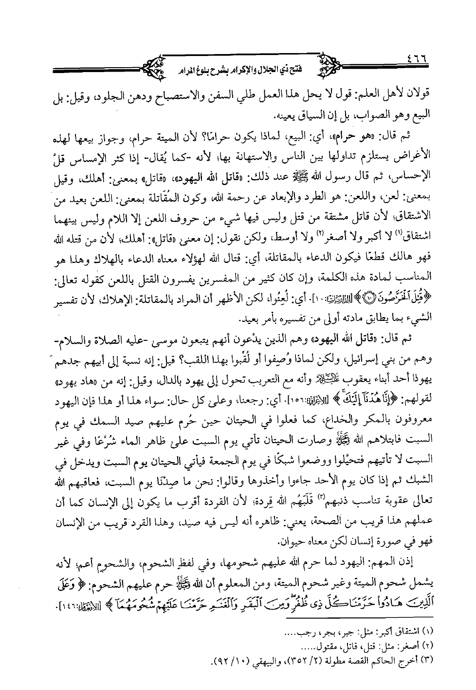 ثم قال: "هو حرام"، أي: البيع، لماذا يكون حرامًا؟ لأن الميتة حرام، وجواز بيعها لهذه الأغراض يستلزم تداولها بين الناس والاستهانة بها؛ لأنه - كما يقال - إذا كثر الإمساس قلَّ الإحساس، ثم قال رسول الله صلى الله عليه وسلم عند ذلك: "قاتل الله اليهود"، "قاتل" بمعنى: أهلك، وقيل بمعنى: لعن، واللعن: هو الطرد والإبعاد عن رحمة الله، وكون المقاتلة بمعنى: اللعن بعيد من الاشتقاق؛ لأن قاتل مشتقة من قتل وليس فيها شيء من حروف اللعن إلا اللام وليس بينهما اشتقاق لا أكبر ولا أصغر ولا أوسط، ولكن نقول: إن معنى "قاتل": أهلك؛ لأن من قتله الله فهو هالك قطعًا فيكون الدعاء بالمقاتلة، أي: قتال الله لهؤلاء معناه الدعاء بالهلاك وهذا هو المناسب لمادة هذه الكلمة، وإن كان كثير من المفسرين يفسرون القتل باللعن كقوله تعالى: {قتل الخراصون} [الذاريات: 10] أي: لعنوا، لكن الأظهر أن المراد بالمقاتلة: الإهلاك؛ لأن تفسير الشيء بما يطابق مادته أولى من تفسيره بأمر بعيد.