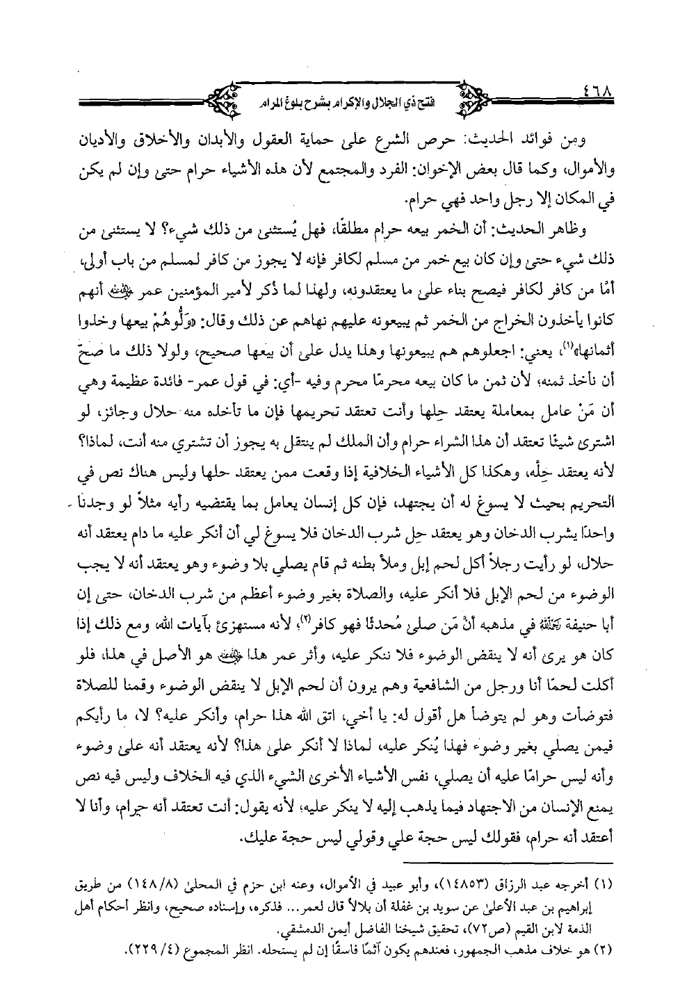 وظاهر الحديث: أن الخمر بيعه حرام مطلقًا، فهل يستثنى من ذلك شيء؟ لا يستثنى من ذلك شيء حتى وإن كان بيع خمر من مسلم لكافر فإنه لا يجوز من كافر لمسلم من باب أولى، أمَّا من كافر لكافر فيصح بناء على ما يعتقدونه، ولهذا لما ذكر لأمير المؤمنين عمر رضي الله عنه أنهم كانوا يأخذون الخراج من الخمر ثم يبيعونه عليهم نهاهم عن ذلك وقال: "ولُّوهم بيعها وخذوا أثمانها"، يعني: اجعلوهم هم يبيعونها وهذا يدل على أن بيعها صحيح، ولولا ذلك ما صحَّ أن نأخذ ثمنه؛ لأن ثمن ما كان بيعه محرمًا محرم وفيه - أي: في قول عمر - فائدة عظيمة وهي أن من عامل بمعاملة يعتقد حلها وأنت تعتقد تحريمها فإن ما تأخذه منه حلال وجائز، لو اشترى شيئًا تعتقد أن هذا الشراء حرام وأن الملك لم ينتقل به يجوز أن تشتري منه أنت، لماذا؟ لأنه يعتقد حلَّه، وهكذا كل الأشياء الخلافية إذا وقعت ممن يعتقد حلها وليس هناك نص في التحريم بحيث لا يسوغ له أن يجتهد، فإن كل إنسان يعامل بما يقتضيه رأيه مثلًا لو وجدنا واحدًا يشرب الدخان وهو يعتقد حل شرب الدخان فلا يسوغ لي أن أنكر عليه ما دام يعتقد أنه حلال، لو رأيت رجلًا أكل لحم إبل وملأ بطنه ثم قام يصلي بلا وضوء وهو يعتقد أنه لا يجب الوضوء من لحم الإبل فلا أنكر عليه، والصلاة بغير وضوء أعظم من شرب الدخان، حتى إن أبا حنيفة رحمه الله في مذهبه أنَّ من صلى محدثًا فهو كافر؛ لأنه مستهزئ بآيات الله، ومع ذلك إذا كان هو يرى أنه لا ينقض الوضوء فلا ننكر عليه، وأثر عمر هذا رضي الله عنه هو الأصل في هذا، فلو أكلت لحمًا أنا ورجل من الشافعية وهم يرون أن لحم الإبل لا ينقض الوضوء وقمنا للصلاة فتوضأت وهو لم يتوضأ هل أقول له: يا أخي، اتق الله هذا حرام، وأنكر عليه؟ لا، ما رأيكم فيمن يصلي بغير وضوء فهذا ينكر عليه، لماذا لا أنكر على هذا؟ لأنه يعتقد أنه على وضوء وأنه ليس حرامًا عليه أن يصلي، نفس الأشياء الأخرى الشيء الذي فيه الخلاف وليس فيه نص يمنع الإنسان من الاجتهاد فيما يذهب إليه لا ينكر عليه، لأنه يقول: أنت تعتقد أنه حرام، وأنا لا أعتقد أنه حرام، فقولك ليس حجة علي وقولي ليس حجة عليك.