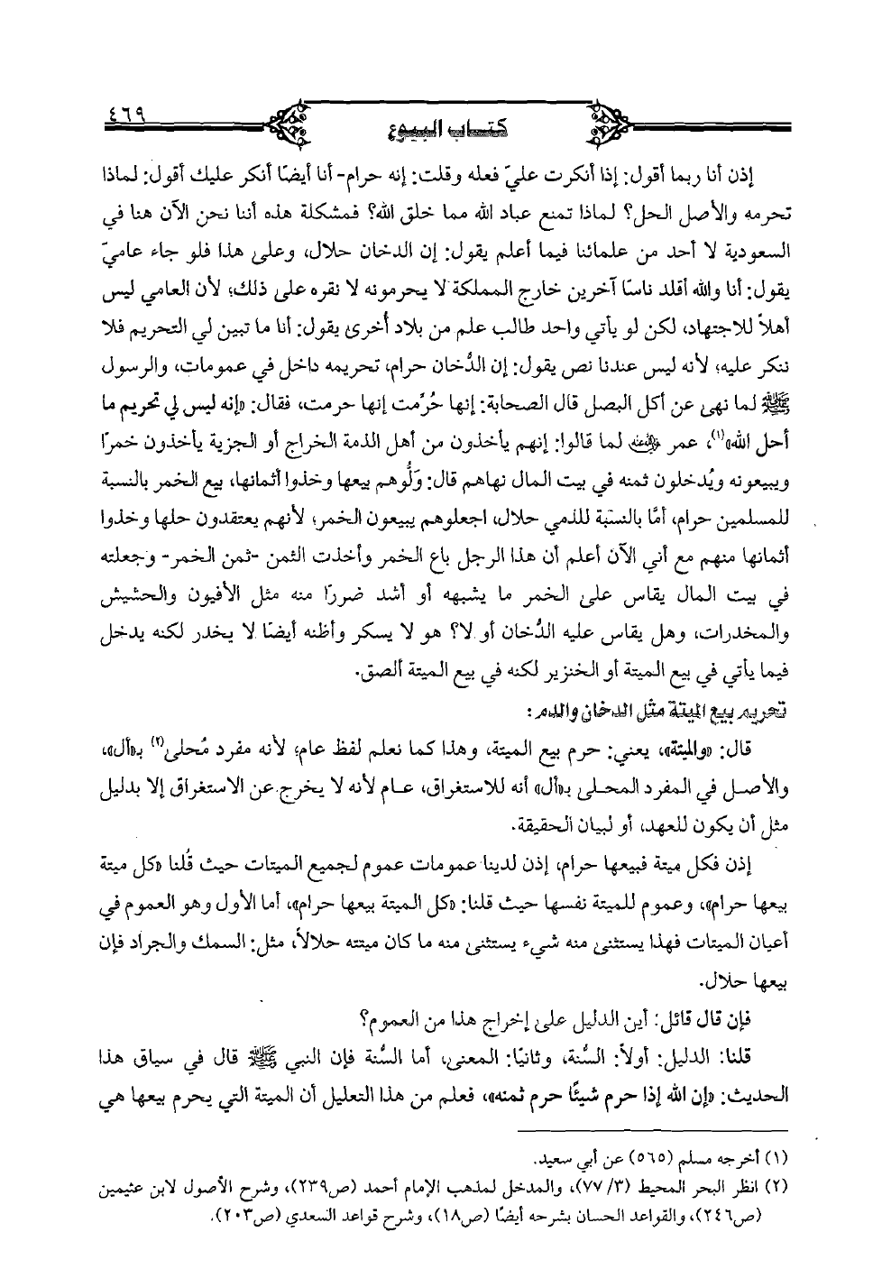 إذن أنا ربما أقول: إذا أنكرت عليّ فعله وقلت: إنه حرام - أنا أيضًا أنكر عليك أقول: لماذا تحرمه والأصل الحل؟ لماذا تمنع عباد الله مما خلق الله؟ فمشكلة هذه أننا نحن الآن هنا في السعودية لا أحد من علمائنا فيما أعلم يقول: إن الدخان حلال، وعلى هذا فلو جاء عاميّ يقول: أنا والله أقلد ناسًا آخرين خارج المملكة لا يحرمونه لا نقره على ذلك؛ لأن العامي ليس أهلًا للاجتهاد، لكن لو يأتي واحد طالب علم من بلاد أخرى يقول: أنا ما تبين لي التحريم فلا ننكر عليه؛ لأنه ليس عندنا نص يقول: إن الدُّخان حرام، تحريمه داخل في عمومات، والرسول صلى الله عليه وسلم لما نهى عن أكل البصل قال الصحابة: إنها حرَّمت أنها حرمت، فقال: "إنه ليس لي تحريم ما أحل الله"، عمر رضي الله عنه لما قالوا: إنهم يأخذون من أهل الذمة الخراج أو الجزية يأخذون خمرًا ويبيعونه ويدخلون ثمنه في بيت المال نهاهم قال: ولُّوهم بيعها وخذوا أثمانها، بيع الخمر بالنسبة للمسلمين حرام، أمَّا بالنسبة للذمي حلال، اجعلوهم يبيعون الخمر؛ لأنهم يعتقدون حلها وخذوا أثمانها منهم مع أني الآن أعلم أن هذا الرجل باع الخمر وأخذت الثمن -ثمن الخمر -وجعلته في بيت المال يقاس على الخمر ما يشبهه أو أشد ضررًا منه مثل الأفيون والحشيش والمخدرات، وهل يقاس عليه الدُّخان أو لا؟ هو لا يسكر وأظنه أيضًا لا يخدر لكنه يدخل فيما يأتي في بيع الميتة أو الخنزير لكنه في بيع الميتة ألصق.
