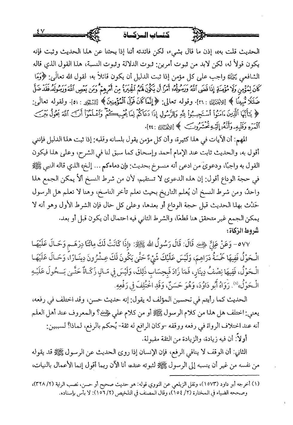 577 - وعن عَليٍّ رضي الله عنه قال: قال رسول الله صلى عليه وسلم: "إذا كانت لك مائتا درهمٍ وحال عليها الحول ففيها خمسة دراهم، وليس عليك شيءٍ حتَّى يكون لك عشرون دينارًا، وحال عليها الحول، ففيها نصف دينارٍ، فما زاد فبحساب ذلك، وليس في مالٍ زكاةٌ حتَّى يحول عليه الحول". رواه أبو داود، وهو حسنٌ، وقد اختلف في رفعه.