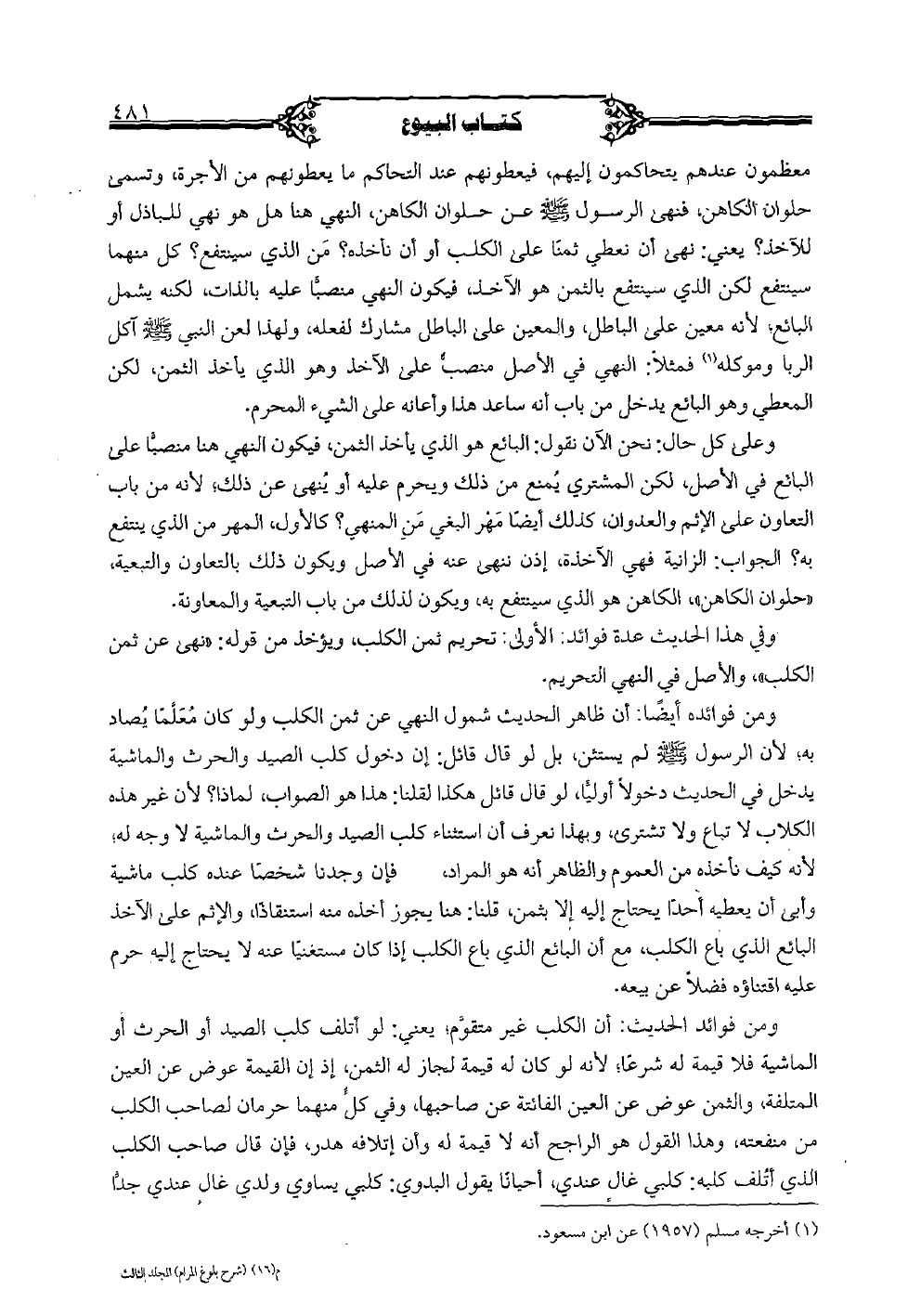 معظمون عندهم يتحاكمون إليهم، فيعطونهم عند التحاكم ما يعطونهم من الأجرة، وتسمى حلوان الكاهن، فنهى الرسول صلى الله عليه وسلم عن حلوان الكاهن، النهي هنا هل هو نهي للباذل أو للآخذ؟ يعني: نهى أن نعطي ثمنًا على الكلب أو أن نأخذه؟ من الذي سينتفع؟ كل منهما سينتفع لكن الذي سينتفع بالثمن هو الآخذ، فيكون النهي منصبًّا عليه بالذات، لكنه يشمل البائع؛ لأنه معين على الباطل، والمعين على الباطل مشارك لفعله، ولهذا لعن النبي صلى الله عليه وسلم آكل الربا وموكله فمثلًا: النهي في الأصل منصبٌّ على الآخذ وهو الذي يأخذ الثمن، لكن المعطي وهو البائع يدخل من باب أنه ساعد هذا وأعانه على الشيء المحرم.