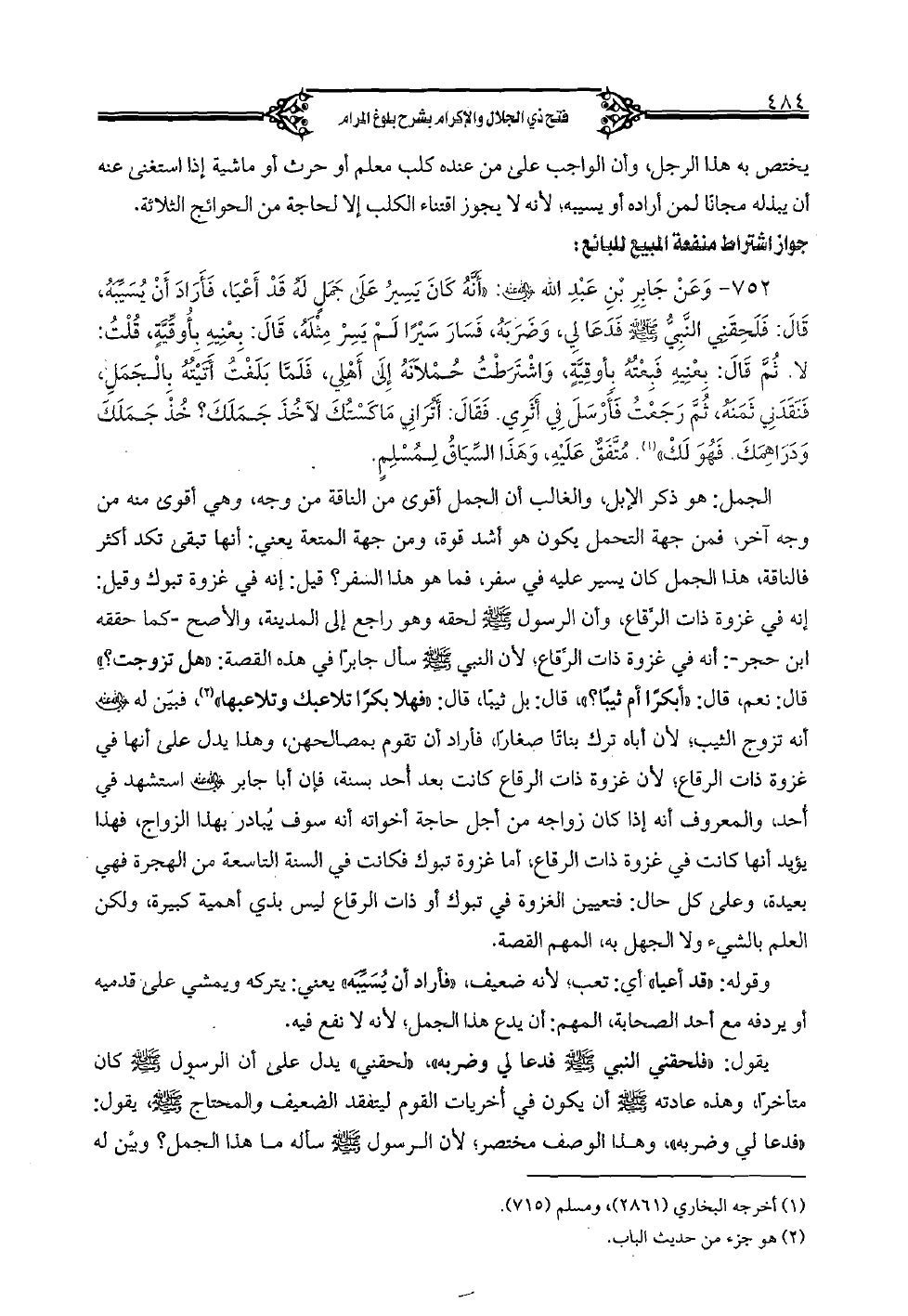 752 - وعن جابر بن عبد الله رضي الله عنه: "أنه كان يسير على جملٍ له قد أعيا، فأراد أن يسيِّبه، قال: فلحقني النَّبيُّ صلى الله عليه وسلم فدعا لي، وضربه، فسار سيرًا لم يسر مثله، قال: بعنيه بأوقِّيَّةٍ، قلت: لا. ثمَّ قال: بعنيه فبعته بأوقيَّةٍ، واشترطت حملانه إلى أهلي، فلمَّا بلغت أتيته بالجمل، فنقدني ثمنه، ثمَّ رجعت فأرسل في أثري. فقال: أتراني ماكستك لآخذ جملك؟ خذ جملك ودراهمك. فهو لك". متَّفقٌ عليه، وهذا السِّياق لمسلمٍ.