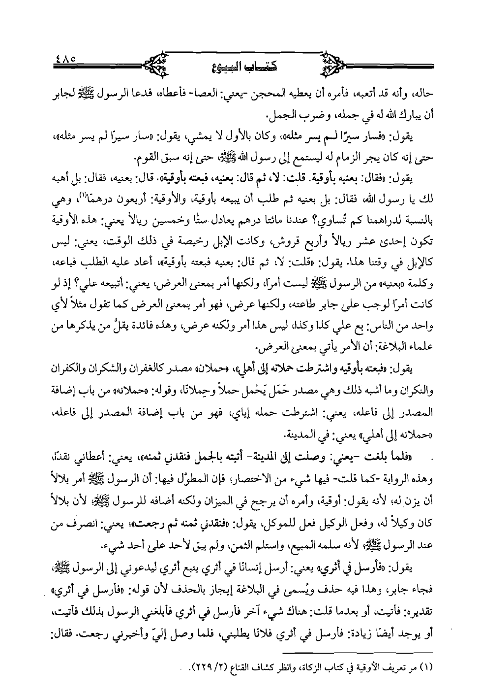 يقول: "فقال: بعنيه بأوقية. قلت: لا، ثم قال: بعنيه، فبعته بأوقية". قال: بعنيه، فقال: بل أهبه لك يا رسول الله، فقال: بل بعنيه ثم طلب أن يبيعه بأوقية، والأوقية: أربعون درهمًا، وهي بالنسبة لدراهمنا كم تساوي؟ عندنا مائتا درهم يعادل ستًّا وخمسين ريالًا يعني: هذه الأوقية تكون إحدى عشر ريالًا وأربع قروش، وكانت الإبل رخيصة في ذلك الوقت، يعني: ليس كالإبل في وقتنا هذا. يقول: "قلت: لا، ثم قال: بعنيه فبعته بأوقية"، أعاد عليه الطلب فباعه، وكلمة "بعنيه" من الرسول صلى الله عليه وسلم ليست أمرًا، ولكنها أمر بمعنى العرض، يعني: أتبيعه علي؟ إذ لو كانت أمرًا لوجب على جابر طاعته، ولكنها عرض، فهو أمر بمعنى العرض كما تقول مثلًا لأي واحد من الناس: بع علي كذا وكذا، ليس هذا أمر ولكنه عرض، وهذه فائدة يقلُّ من يذكرها من علماء البلاغة: أن الأمر يأتي بمعنى العرض.