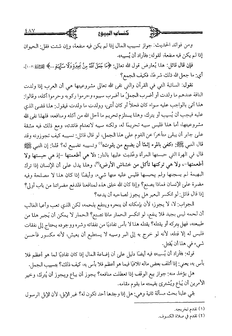 نقول: السائبة التي في القرآن والتي نفى الله تعالى مشروعيتها هي أن العرب إذا ولدت الناقة عندهم ما ولدت أو أضرب الجمل ما أضرب سيبوه وحرموا ركوبه وحرموا أكله، وقالوا: هذا أتى بالواجب عليه سواء كان فحلًا أو كان أنثى، وولدت ما ولدت فيقول: هذا قضى الذي عليه فيجب أن يسيب أو يترك، وهذا يستلزم تحريم ما أحل الله من أكله ومنافعه؛ فلهذا نفى الله مشروعيتها، أما هذا فليس سيبه تحريمًا له، ولكنه سيبه لانعدام فائدته، ومع ذلك فيه مشقة على جابر أن يبقى متأخرًا عن القوم على هذا الجمل، لو قال قائل: تسييبه كيف تجوزونه وقد قال النبي صلى الله عليه وسلم: "كفى بالمرء إثمًا أن يضيع من يقوت" وتسييبه تضييع له؟ قلنا: إن النبي صلى الله عليه وسلم قال في الهرة التي حبستها المرأة وعذبت عليها بالنار: "لا هي أطعمتها -إذ هي حبستها ولا أطعمتها-، ولا هي تركتها تأكل من خشاش الأرض"، وهذا يدل على أن الإنسان إذا ترك البهيمة لم يسجنها ولم يحبسها فليس عليه منها شيء، وأيضًا إذا كان هذا لا مصلحة وفيه مضرة على الإنسان فماذا يصنع؟ وإذا كان الله خلق هذه لمنافعنا فلدفع مضراتنا من باب أولى؟ إذ قال قائل: لو انكسر البعير هل يجوز لصاحبه أن يدعه؟