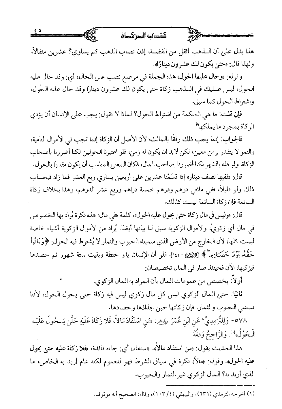 هذا الحديث يقول: "من استفاد مالًا"، "استفاد" أي: جاءه فائدة، "فلا زكاة عليه حتى يحول عليه الحول". وقوله: "مالا" نكرة في سياق الشرط فهو للعموم لكنه عام أريد به الخاص، ما الذي أريد به؟ المال الزكوي غير الثمار والحبوب.