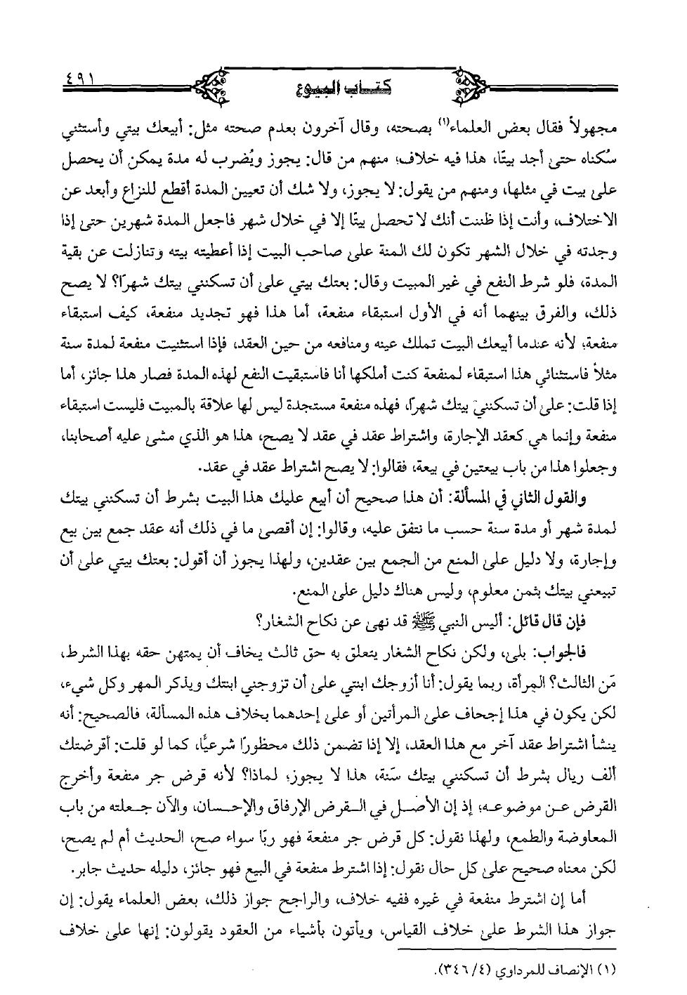 مجهولًا فقال بعض العلماء بصحته، وقال آخرون بعدم صحته مثل: أبيعك بيتي وأستثني سكناه حتى أجد بيتًا، هذا فيه خلاف؛ منهم من قال: يجوز ويضرب له مدة يمكن أن يحصل على بيت في مثلها، ومنهم من يقول: لا يجوز، ولا شك أن تعيين المدة أقطع للنزاع وأبعد عن الاختلاف، وأنت إذا ظننت أنك لا تحصل بيتًا إلا في خلال شهر فاجعل المدة شهرين حتى إذا وجدته في خلال الشهر تكون لك المنة على صاحب البيت إذا أعطيته بيته وتنازلت عن بقية المدة، فلو شرط النفع في غير المبيت وقال: بعتك بيتي على أن تسكنني بيتك شهرًا؟ لا يصح ذلك، والفرق بينهما أنه في الأول استبقاء منفعة، أما هذا فهو تجديد منفعة، كيف استبقاء منفعة؛ لأنه عندما أبيعك البيت تملك عينه ومنافعه من حين العقد، فإذا استثنيت منفعة لمدة سنة مثلًا فاستثناني هذا استبقاء لمنفعة كنت أملكها أنا فاستبقيت النفع لهذه المدة فصار هذا جائز، أما إذا قلت: على أن تسكنني بيتك شهرًا، فهذه منفعة مستجدة ليس لها علاقة بالمبيت فليست استبقاء منفعة وإنما هي كعقد الإجارة، واشتراط عقد في عقد لا يصح، هذا هو الذي مشى عليه أصحابنا، وجعلوا هذا من باب بيعتين في بيعة، فقالوا: لا يصح اشتراط عقد في عقد.